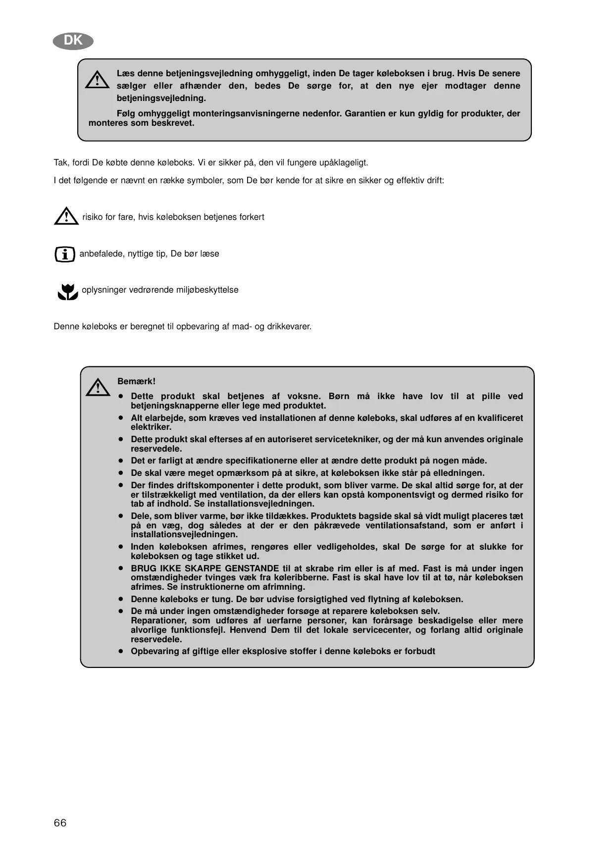 Tak, fordi De købte denne køleboks. Vi er sikker på, den vil fungere upåklageligt. I det følgende er nævnt en række symboler, som De bør kende for at sikre en sikker og effektiv drift: