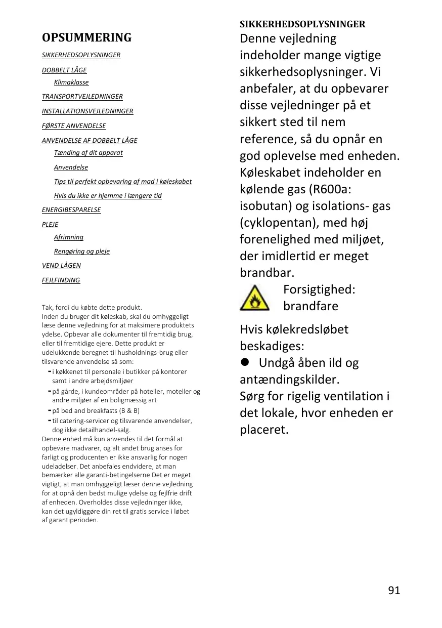 Nous vous suggérons de conserver ces instructions dans un endroit sûr pour une référence ultérieure aisée et une bonne utilisation de l’appareil. Ce réfrigérateur contient un gaz réfrigérant (R600a : isobutane) et un gaz isolant (cyclopentane), qui présentent une compatibilité élevée avec l’environnement mais des propriétés inflammables. Attention : risque d’incendie En cas de dommages du circuit de réfrigérant : Éviter des flammes ouvertes et des sources d’inflammation. Bien aérer la pièce dans laquelle se trouve l’appareil. AVERTISSEMENT ! Il convient de prêter une attention particulière lors du nettoyage/du transport de l’appareil pour éviter de 26