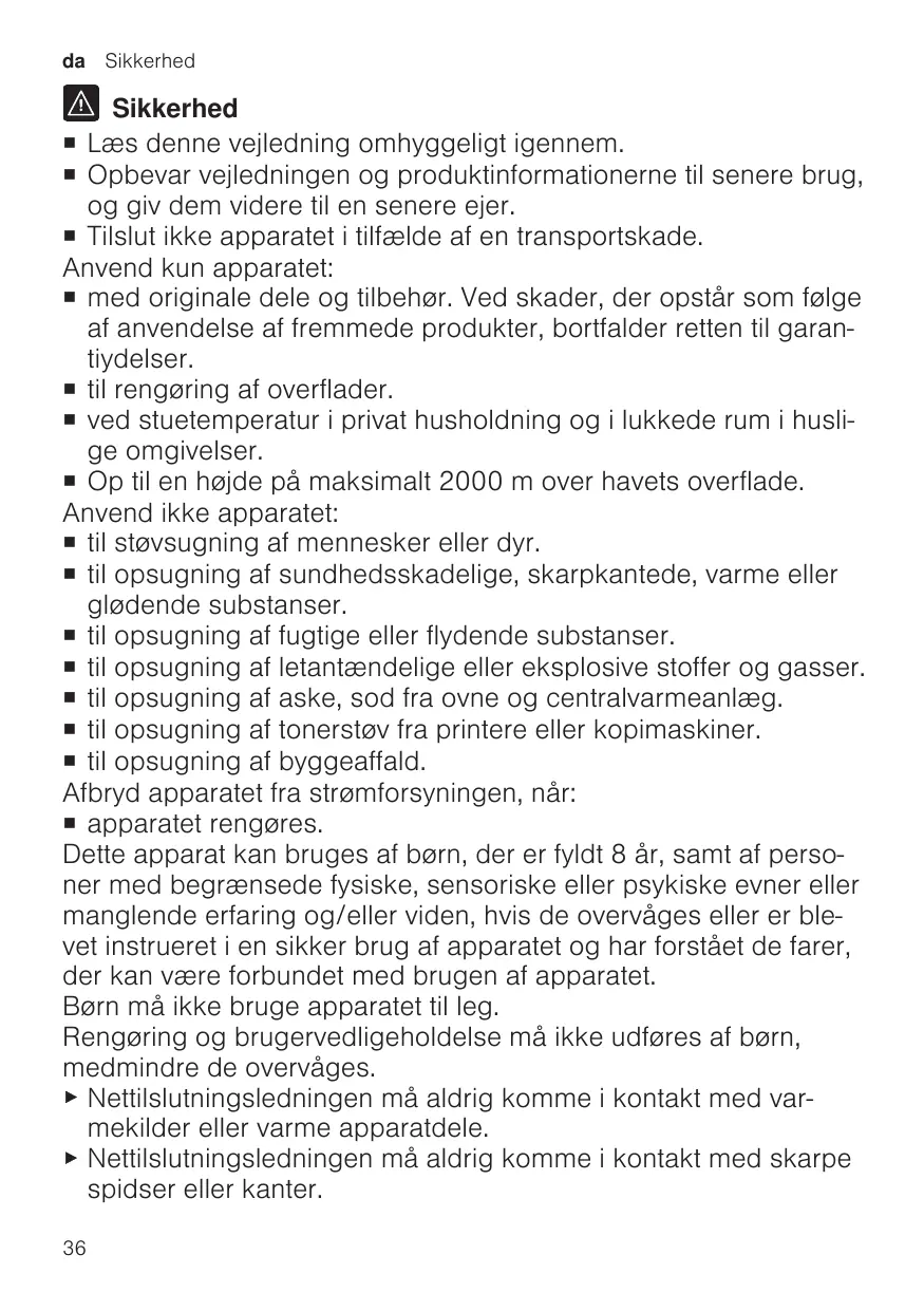 Sikkerhed ¡ Læs denne vejledning omhyggeligt igennem. ¡ Opbevar vejledningen og produktinformationerne til senere brug, og giv dem videre til en senere ejer. ¡ Tilslut ikke apparatet i tilfælde af en transportskade. Anvend kun apparatet: ¡ med originale dele og tilbehør. Ved skader, der opstår som følge af anvendelse af fremmede produkter, bortfalder retten til garantiydelser. ¡ til rengøring af overflader. ¡ ved stuetemperatur i privat husholdning og i lukkede rum i huslige omgivelser. ¡ Op til en højde på maksimalt 2000 m over havets overflade. Anvend ikke apparatet: ¡ til støvsugning af mennesker eller dyr. ¡ til opsugning af sundhedsskadelige, skarpkantede, varme eller glødende substanser. ¡ til opsugning af fugtige eller flydende substanser. ¡ til opsugning af letantændelige eller eksplosive stoffer og gasser. ¡ til opsugning af aske, sod fra ovne og centralvarmeanlæg. ¡ til opsugning af tonerstøv fra printere eller kopimaskiner. ¡ til opsugning af byggeaffald. Afbryd apparatet fra strømforsyningen, når: ¡ apparatet rengøres. Dette apparat kan bruges af børn, der er fyldt 8 år, samt af personer med begrænsede fysiske, sensoriske eller psykiske evner eller manglende erfaring og/eller viden, hvis de overvåges eller er blevet instrueret i en sikker brug af apparatet og har forstået de farer, der kan være forbundet med brugen af apparatet. Børn må ikke bruge apparatet til leg. Rengøring og brugervedligeholdelse må ikke udføres af børn, medmindre de overvåges. ▶ Nettilslutningsledningen må aldrig komme i kontakt med varmekilder eller varme apparatdele. ▶ Nettilslutningsledningen må aldrig komme i kontakt med skarpe spidser eller kanter. 36
