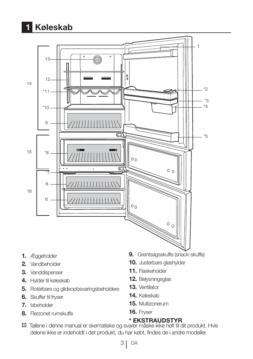 9. Grøntsagsskuffe (snack-skuffe) 10. Justerbare glashylder 11. Flaskeholder 12. Belysningsglas 13. Ventilator 14. Køleskab 15. Multizonerum 16. Fryser * EKSTRAUDSTYR