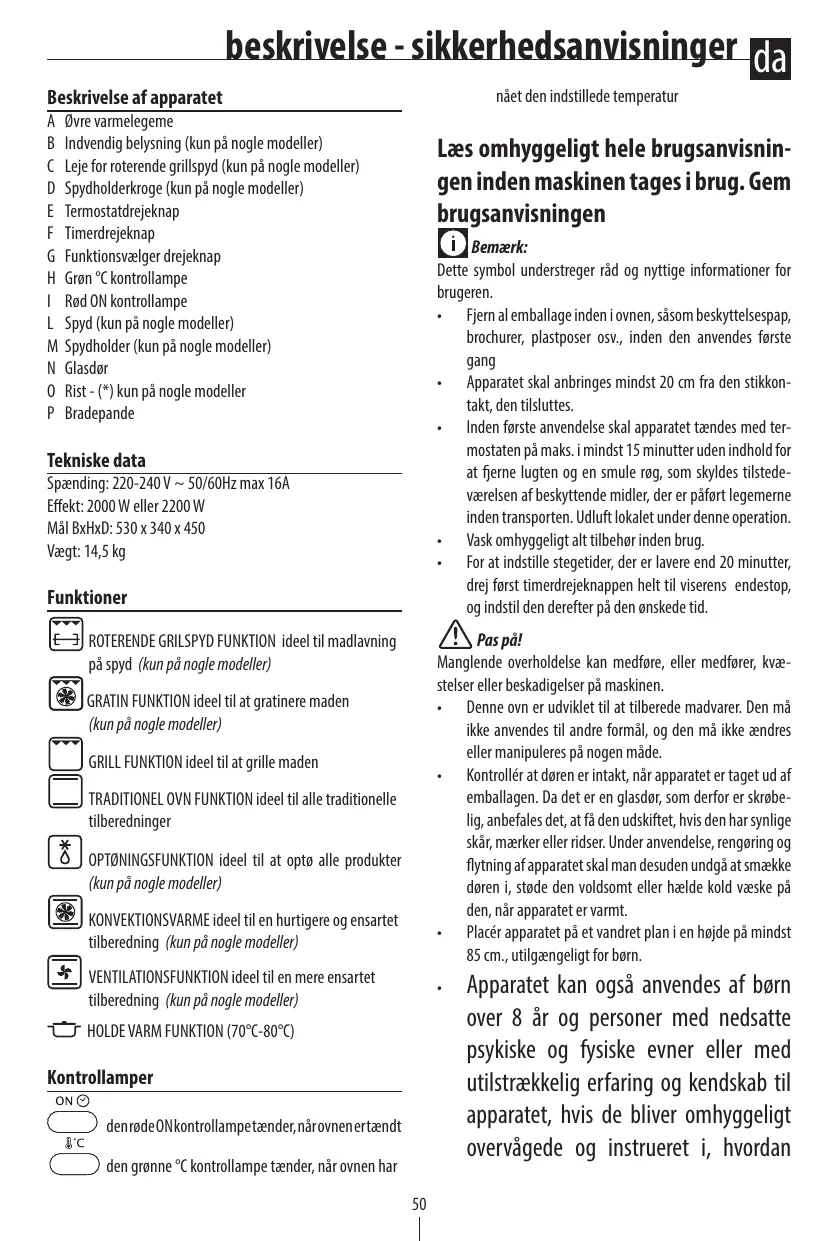 N’utilisez pas l’appareil si : Son cordon d’alimentation est défectueux L’appareil est tombé ou s’il présente des dégâts visibles ou des anomalies de fonctionnement. Le cas échéant, afin d’éviter tout risque, faites-le vérifier par le Centre de Service Après-vente le plus proche. N’installez pas l’appareil à proximité de sources de chaleur. N’utilisez pas l’appareil comme source de chaleur. Ne mettez jamais de papier, carton ou plastique dans le four et ne posez jamais rien dessus (ustensiles, grilles ou autres objets). N’introduisez rien dans les bouches de ventilation. Veillez à ne pas les obstruer. Ce four n’est pas conçu pour être encastré. Une fois la porte ouverte, n’y appuyez jamais des objets lourds, des casseroles ou récipients brûlants. Ne tirez pas la poignée vers le bas. La responsabilité du fabricant ne sera pas engagée en cas d’usage professionnel, non approprié ou non conforme au mode d’emploi, et la garantie sera annulée.