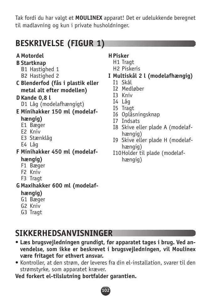 Tak fordi du har valgt et MOULINEX apparat! Det er udelukkende beregnet til madlavning og kun i private husholdninger. BESKRIVELSE (FIGUR 1) A Motordel B Startknap B1 Hastighed 1 B2 Hastighed 2 C Blenderfod (fås i plastik eller metal alt efter modellen) D Kande 0,8 l D1 Låg (modelafhængigt) E Minihakker 150 ml (modelafhængig) E1 Bæger E2 Kniv E3 Stænklåg E4 Låg F Minihakker 450 ml (modelafhængig) F1 Bæger F2 Kniv F3 Tragt G Maxihakker 600 ml (modelafhængig) G1 Bæger G2 Kniv G3 Tragt H Pisker H1 Tragt H2 Piskeris I Multiskål 2 l (modelafhængig) I1 Skål I2 Medløber I3 Kniv I4 Låg I5 Tragt I6 Oplåsningsknap I7 Indsats I8 Skive eller plade A (modelafhængig) I9 Skive eller plade H (modelafhængig) I10Holder til plade (modelafhængig) SIKKERHEDSANVISNINGER