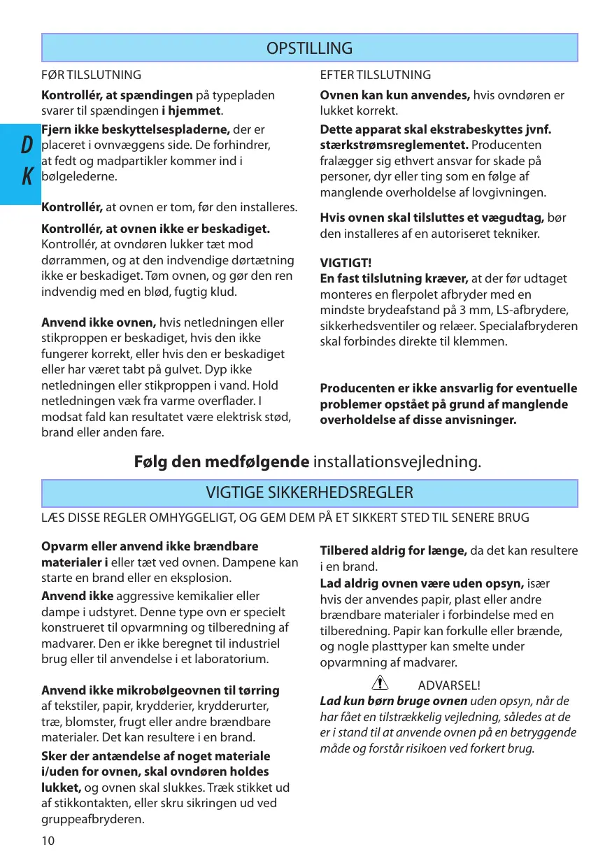 Ovnen kan kun anvendes, hvis ovndøren er lukket korrekt. Dette apparat skal ekstrabeskyttes jvnf. stærkstrømsreglementet. Producenten fralægger sig ethvert ansvar for skade på personer, dyr eller ting som en følge af manglende overholdelse af lovgivningen.