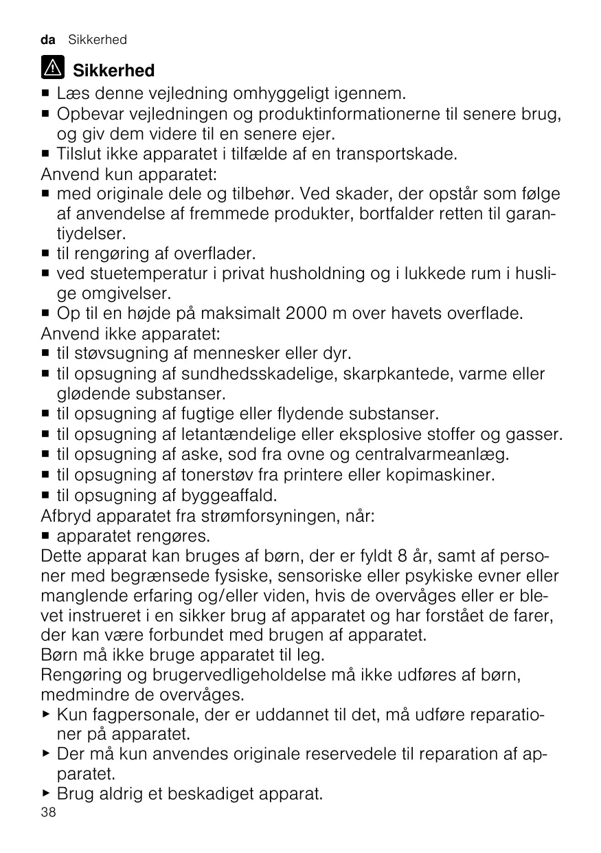 ¡ avec des pièces et accessoires d’origine. En cas de dommages dus à l’utilisation de produits tiers, le droit à la garantie expire. ¡ pour nettoyer les surfaces. ¡ pour un usage domestique privé et dans les pièces fermées d’un domicile, à la température ambiante. ¡ jusqu'à une altitude maximale de 2000 m au-dessus du niveau de la mer. N’utilisez pas l’appareil : ¡ pour l’aspiration de personnes et d’animaux. ¡ pour l’aspiration de substances nocives pour la santé, aux arêtes vives, chaudes ou brûlantes. ¡ pour l’aspiration de substances humides ou liquides. ¡ pour l’aspiration de substances et gaz légèrement inflammables ou explosibles. ¡ pour l’aspiration de cendres, de la suie de four et d’installations de chauffage central. ¡ pour l’aspiration de poussières de toner des imprimantes et copieurs. ¡ pour l’aspiration de débris de construction. Débranchez l’appareil du secteur lorsque : ¡ vous nettoyez l’appareil. Les enfants de 8 ans et plus, les personnes souffrant d’un handicap physique, sensoriel ou mental ou ne détenant pas l’expérience et/ou les connaissances nécessaires pourront utiliser cet appareil à condition de le faire sous surveillance, ou que son utilisation sûre leur ait été enseignée et qu’ils aient compris les dangers qui en émanent. Les enfants ne sont pas autorisés à jouer avec l'appareil. 20