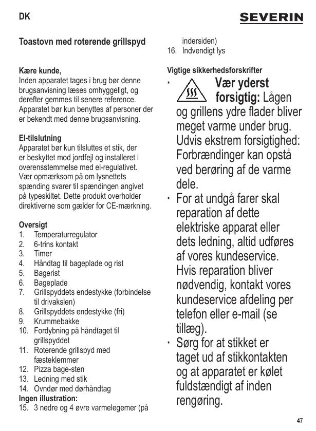 Vær yderst forsigtig: Lågen og grillens ydre flader bliver meget varme under brug. Udvis ekstrem forsigtighed: Forbrændinger kan opstå ved berøring af de varme dele. ∙ For at undgå farer skal reparation af dette elektriske apparat eller dets ledning, altid udføres af vores kundeservice. Hvis reparation bliver nødvendig, kontakt vores kundeservice afdeling per telefon eller e-mail (se tillæg). ∙ Sørg for at stikket er taget ud af stikkontakten og at apparatet er kølet fuldstændigt af inden rengøring. 47