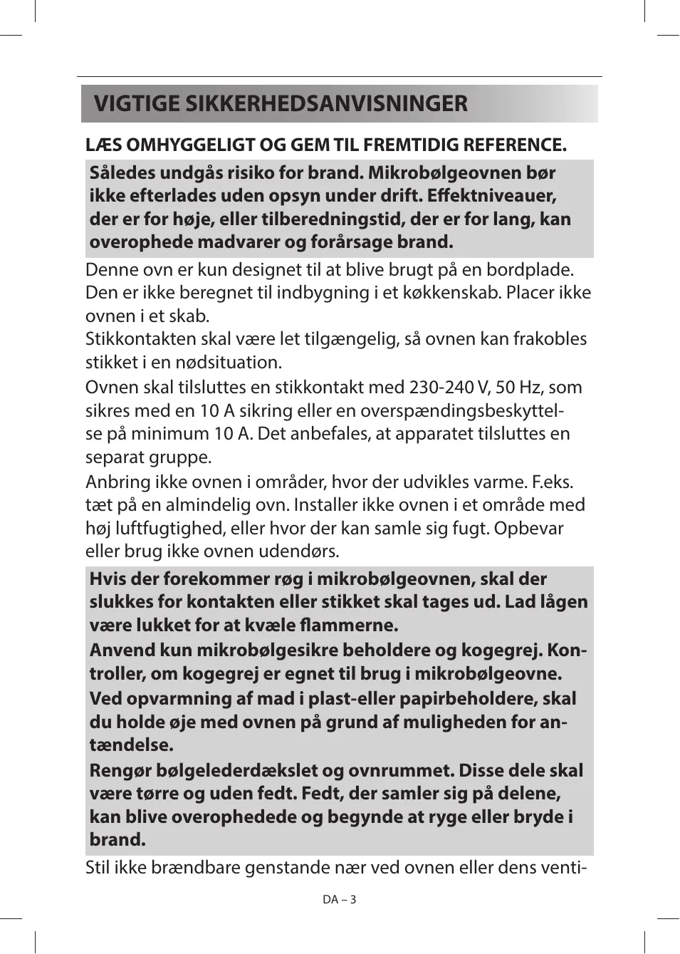 élément de cuisine. Veuillez ne pas placer le four dans un placard. La prise secteur doit être facilement accessible, afin que la fiche du cordon d’alimentation puisse être aisément débranchée en cas d’urgence. La tension d’alimentation doit être égale à 230-240 V, 50 Hz avec un fusible de distribution de 10 A minimum, ou un disjoncteur de 10 A minimum. La prise secteur doit être facilement accessible, afin que la fiche du cordon d’alimentation puisse être aisément débranchée en cas d’urgence. Veuillez ne pas placer votre four à proximité d’une zone génératrice de chaleur. Par exemple, près d’un four à cuisson conventionnelle. Ne placez pas ce four dans une atmosphère à humidité élevée ou bien où l’humidité peut s'accumuler. Ne stockez et n'utilisez pas le four à l’extérieur. Si vous observez la présence de fumée, éteignez ou débranchez le four et laissez la porte fermée afin d’étouffer les flammes. Utilisez uniquement des récipients et ustensiles compatibles avec la cuisson au micro-ondes. Il est important de vérifier que les ustensiles utilisés soient bien compatibles avec la cuisson au micro-ondes. Lorsque vous réchauffez un plat dans un récipient en plasFR – 3