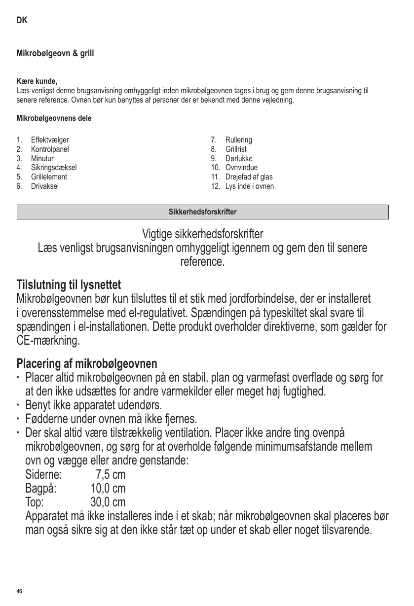Lisez attentivement les instructions ci-après et conservez ce manuel d’instructions pour toute référence ultérieure. Branchement au secteur L’appareil doit être branché exclusivement sur une prise de courant avec terre, installée selon les normes en vigueur. Assurez-vous que la tension d’alimentation correspond à la tension indiquée sur la plaque signalétique de l’appareil. Ce produit est conforme aux directives obligatoires inhérentes au marquage CE. Positionnement de l’appareil ∙ Installez toujours le four à micro-ondes sur une surface stable et plane, résistante à la chaleur et à l’abri de toute source de chaleur ou d’humidité excessive. ∙ Ne pas utiliser l’appareil en plein air. ∙ Les pieds de l’appareil ne doivent pas être enlevés. ∙ Assurez une ventilation suffisante et constante. Ne placez aucun objet sur l’appareil et veillez à ce que les distances minimales suivantes soient respectées entre l’appareil et le mur ou tout autre objet : Côtés: 7,5 cm A l’arrière: ∙ Utilisez uniquement des ustensiles adaptés à la cuisson au four micro-ondes. Ne pas utiliser de récipients en métal lors du réchauffage d’aliments ou de boissons pour la fonction cuisson aux micro-ondes. Pour des informations plus détaillées, veuillez vous référer au paragraphe Utilisez toujours des ustensiles de cuisine appropriés. ∙ L’appareil n’est pas destiné à être utilisé avec un programmateur externe ou une télécommande indépendante. ∙ Cet appareil peut être utilisé par des enfants (à partir de 8 ans) et par des personnes souffrant de déficiences physiques, sensorielles ou mentales, ou manquant d’expérience ou de connaissances, s’ils ont été formés à l’utilisation de l’appareil et ont été supervisés, et s’ils en comprennent les dangers et les précautions de sécurité à prendre. ∙ Les enfants ne sont pas autorisés à jouer avec l’appareil. ∙ Les enfants ne doivent pas être autorisés à nettoyer ou à entreprendre des travaux de maintenance sur l’appareil à moins d’être supervisés. ∙ L’appareil et son cordon d’alimentation doivent être, à tout moment, tenus hors de portée des enfants de moins de 8 ans. ∙ Pour éviter le risque de chocs électriques, ne pas nettoyer l’appareil avec du liquide et ne pas le plonger dans du liquide. ∙ Avertissement : En raison des très hautes températures utilisées par les fonctions combinées, cet appareil ne doit pas être utilisé par les enfants sans la surveillance d’un adulte. ∙ Lors de l’utilisation des fonctions gril ou combinées, prenez soin de ne pas toucher la résistance interne. ∙ L’emploi d’appareils de nettoyage à la vapeur pour nettoyer ce four est interdit. ∙ Éteignez toujours l’appareil et débranchez la fiche de la prise de courant: - avant tout nettoyage, - en cas de fonctionnement défectueux.