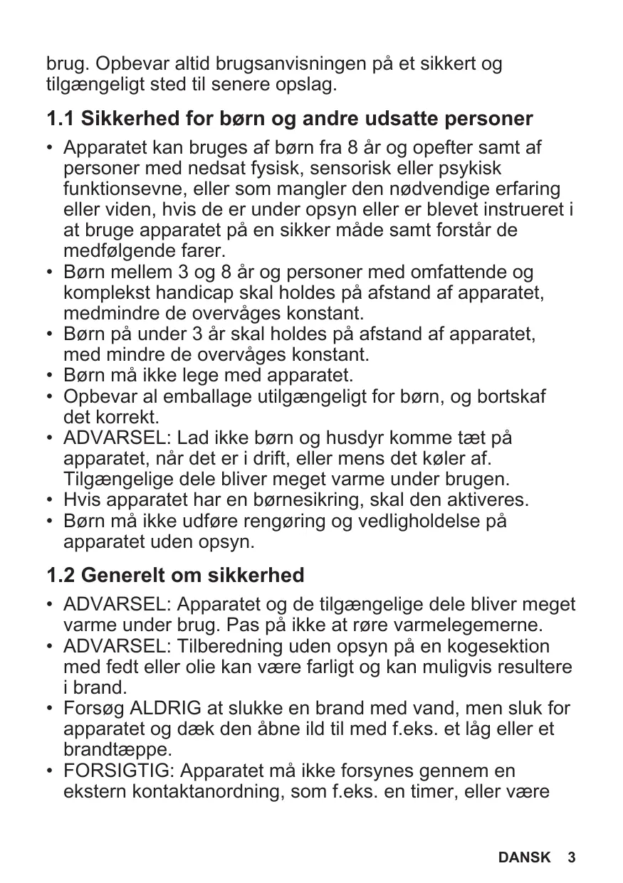 - ADVARSEL: Apparatet og de tilgængelige dele bliver meget varme under brug. Pas på ikke at røre varmelegemerne.
