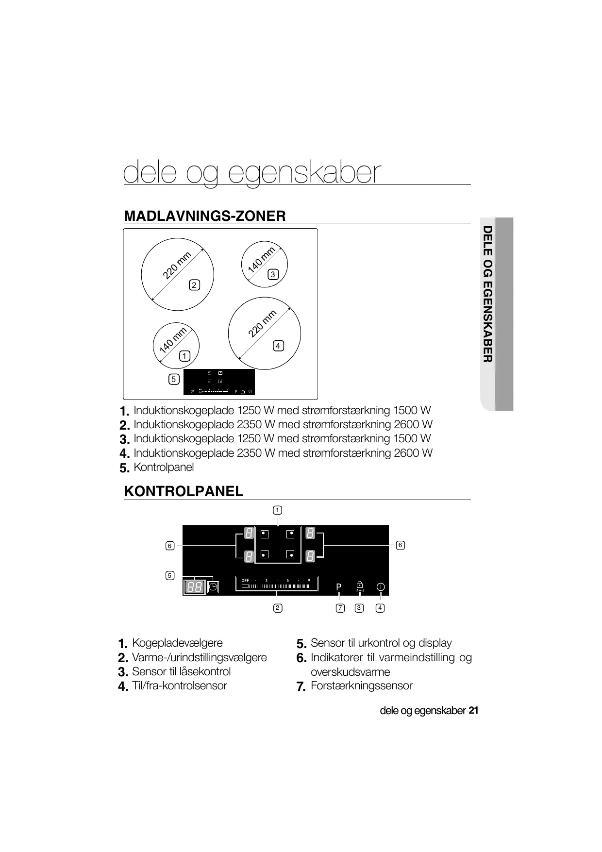 1. Induktionskogeplade 1250 W med strømforstærkning 1500 W 2. Induktionskogeplade 2350 W med strømforstærkning 2600 W 3. Induktionskogeplade 1250 W med strømforstærkning 1500 W 4. Induktionskogeplade 2350 W med strømforstærkning 2600 W 5. Kontrolpanel