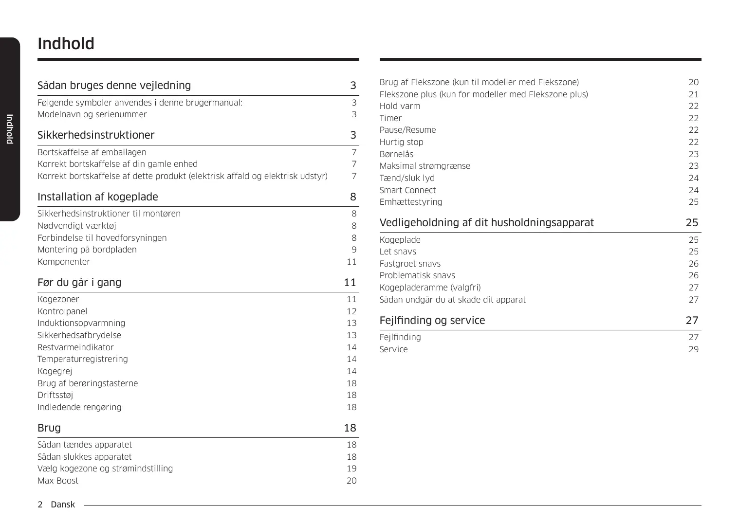 Brug af Flekszone (kun til modeller med Flekszone) Flekszone plus (kun for modeller med Flekszone plus) Hold varm Timer Pause/Resume Hurtig stop Børnelås Maksimal strømgrænse Tænd/sluk lyd Smart Connect Emhættestyring