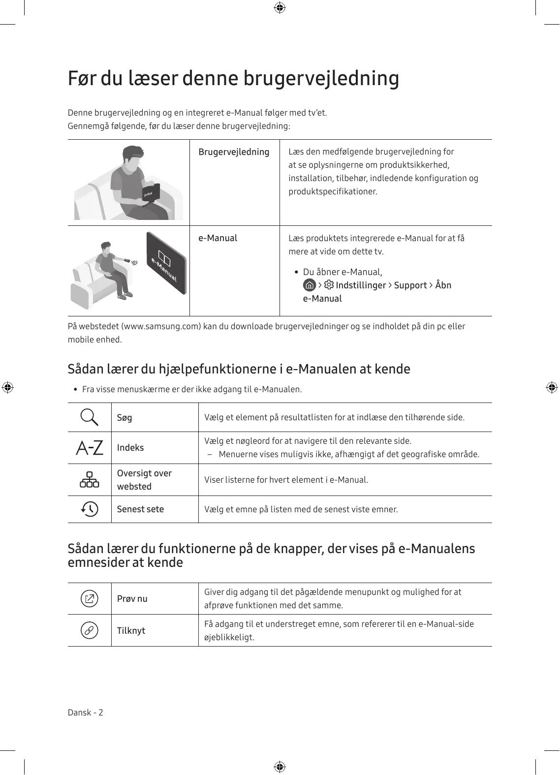 For du læser denne brugervejledning Denne brugervejledning og en integreret e-Manual falger med tv'et. Gennemgä folgende, far du læser denne brugervejledning: Brugervejledning Læs den medfalgende brugervejledning for | ed at se oplysningerne om produktsikkerhed, installation, tilbehgr, indledende konfiguration og produktspecifikationer. e-Manual Læs produktets integrerede e-Manual for at fà e mere at vide om dette tv. + Du äbnere-Manual, © > 8 indstillinger > Support > Abn e-Manual Pä webstedet (www.samsung.com) kan du downloade brugervejledninger og se indholdet pà din pc eller mobile enhed. Sädan lærer du hjælpefunktionerne i e-Manualen at kende + Fra visse menuskærme er der ikke adgang til e-Manualen. @Y Sag Vælg et element pä resultatlisten for at indlæse den tilhgrende side. A 7 Indeks Vælg et nggleord for at navigere til den relevante side. — Menuerne vises muligvis ikke, afhængigt af det geografiske omräde. Oversigt over A g Viser Listerne for hvert element i e-Manual. websted D Senest sete Vælg et emne pä listen med de senest viste emner. Sädan lærer du funktionerne pà de knapper, der vises pà e-Manualens emnesider at kende (@) Prev nu Giver dig adgang til det pägældende menupunkt og mulighed for at afprave funktionen med det samme. ©) Tilknyt Fà adgang til et understreget emne, som refererer til en e-Manual-side y ajeblikkeligt. Dansk -2