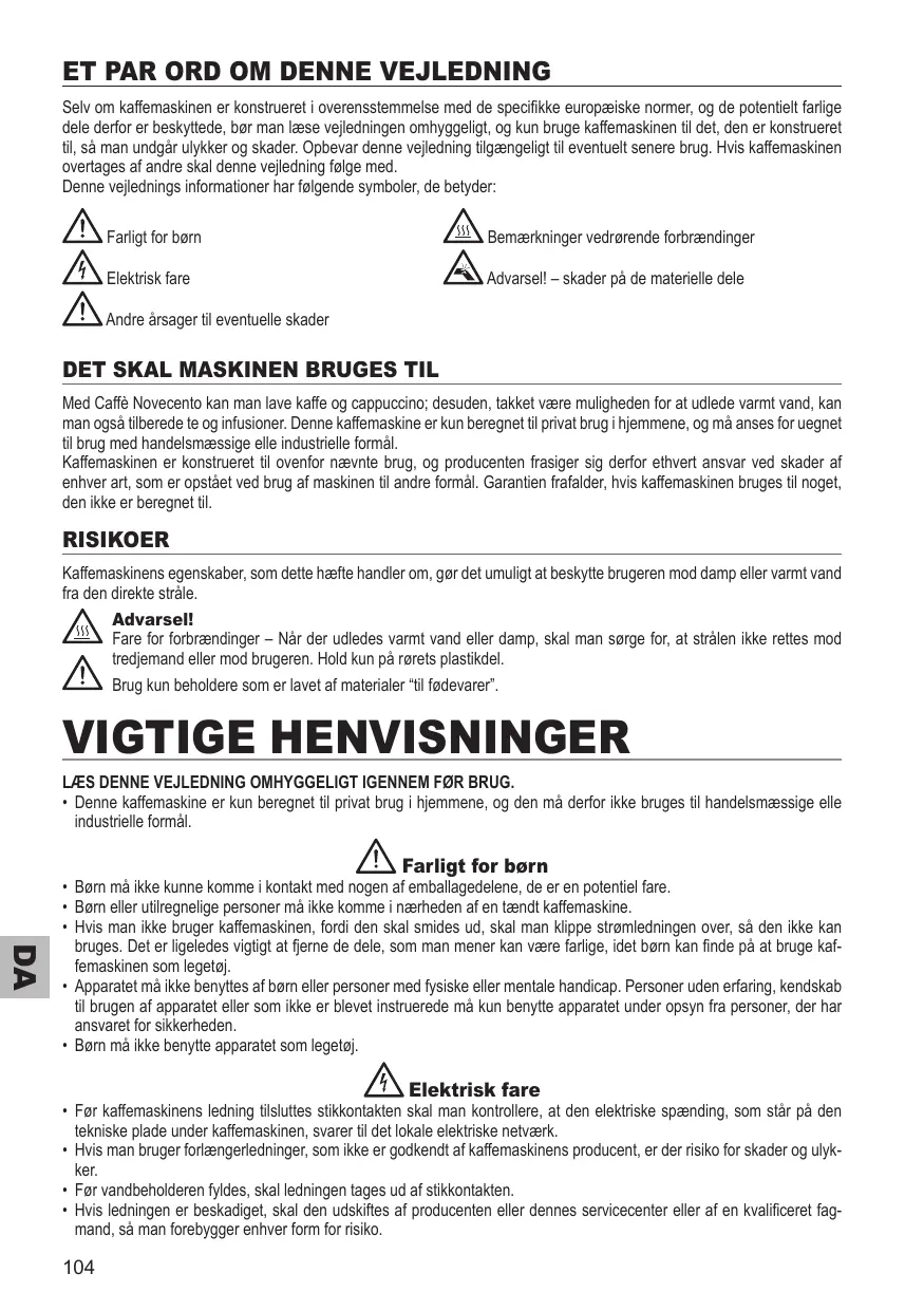 eT pAr OrD OM Denne VeJleDnIng Selv om kaffemaskinen er konstrueret i overensstemmelse med de speciikke europæiske normer, og de potentielt farlige dele derfor er beskyttede, bør man læse vejledningen omhyggeligt, og kun bruge kaffemaskinen til det, den er konstrueret til, så man undgår ulykker og skader. Opbevar denne vejledning tilgængeligt til eventuelt senere brug. Hvis kaffemaskinen overtages af andre skal denne vejledning følge med. Denne vejlednings informationer har følgende symboler, de betyder: Farligt for børn