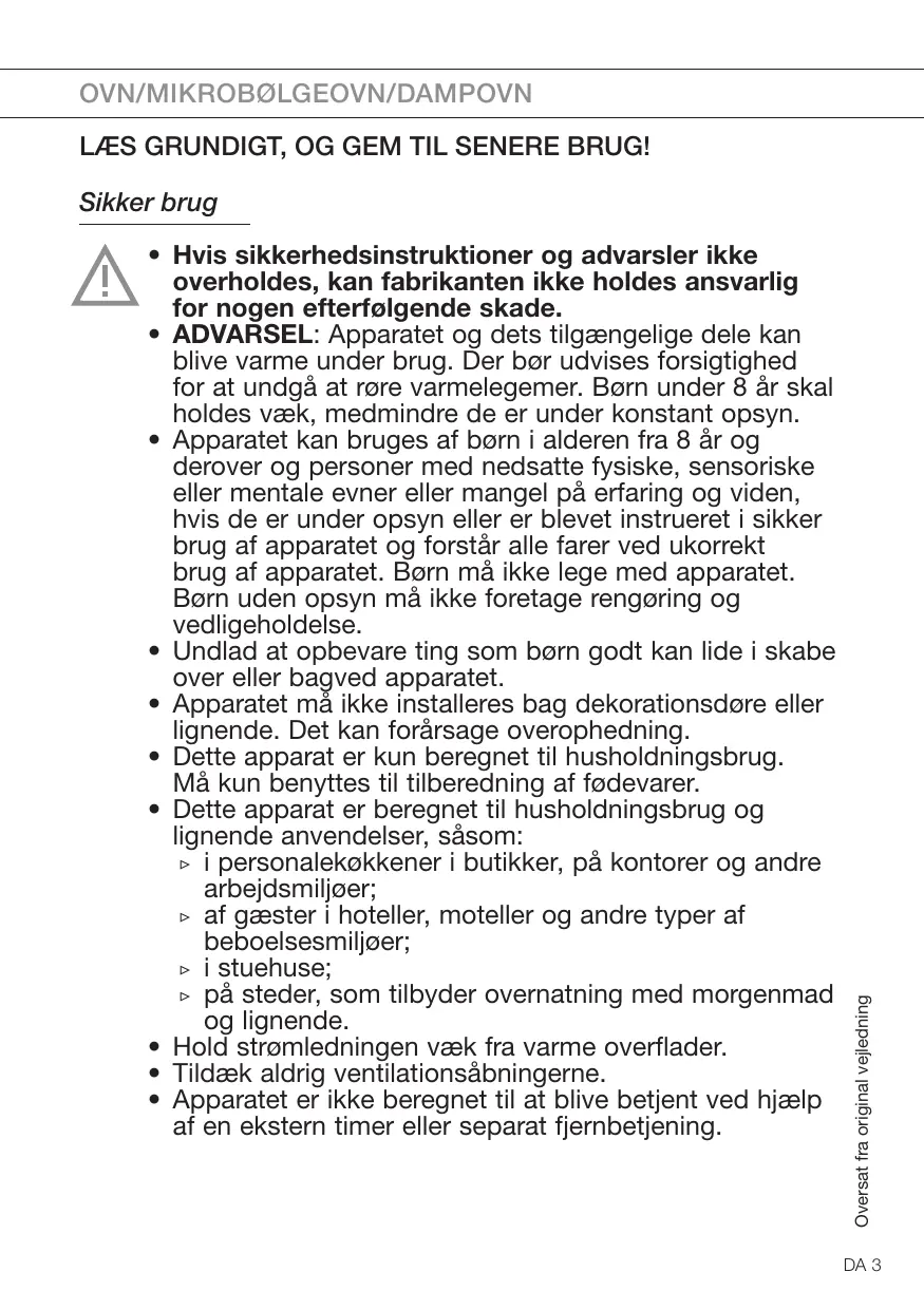 - Apparatet er ikke beregnet til at blive betjent ved hjælp af en ekstern timer eller separat fjernbetjening. Oversat fra original vejledning Sikker brug DA 3