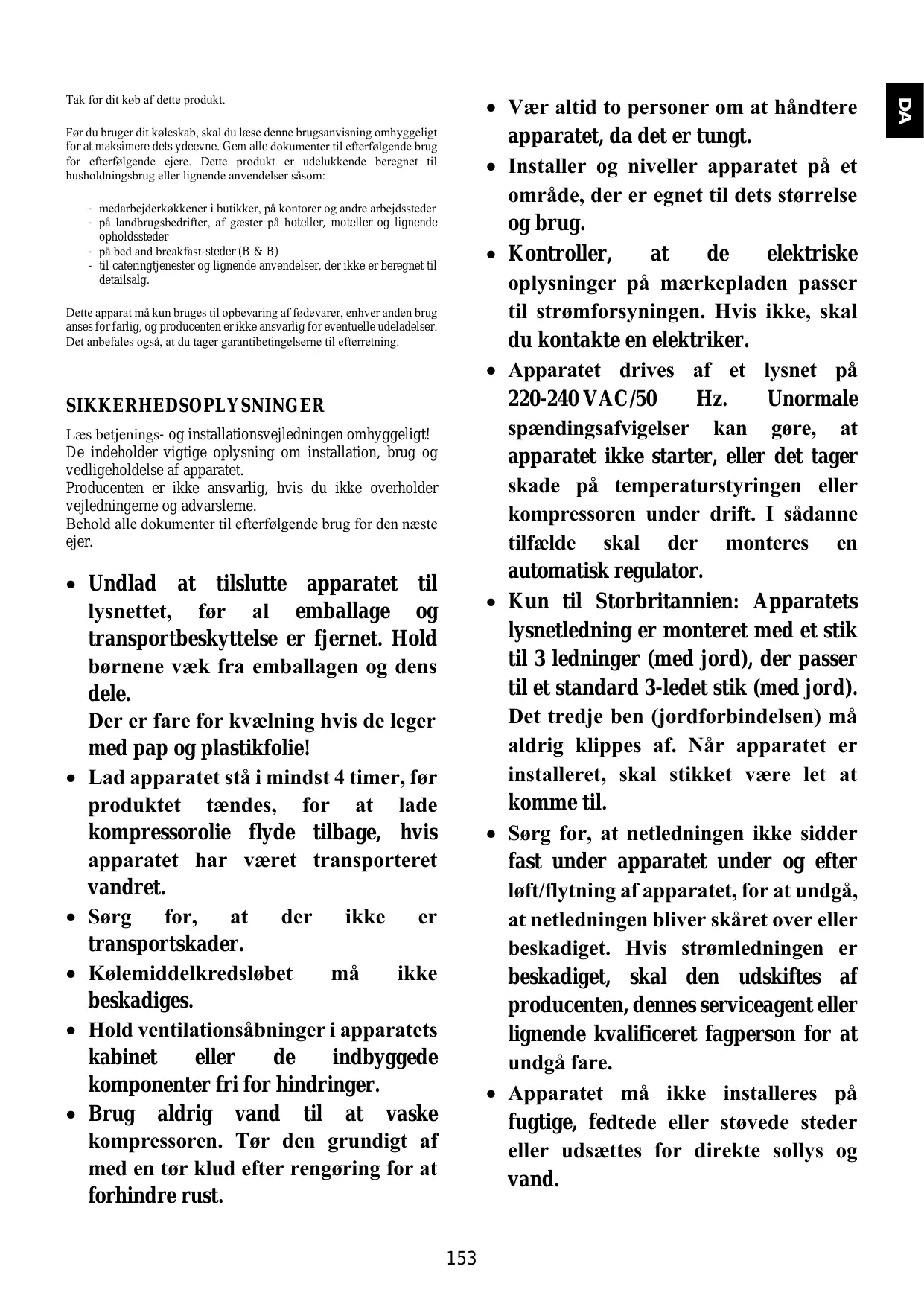 Cet appareil doit être utilisé uniquement pour conserver de la nourriture ; tout autre usage est considéré comme dangereux et le fabricant ne sera pas tenu responsable en cas de mauvaise utilisation. Il est donc recommandé de prendre connaissance des conditions de garantie.