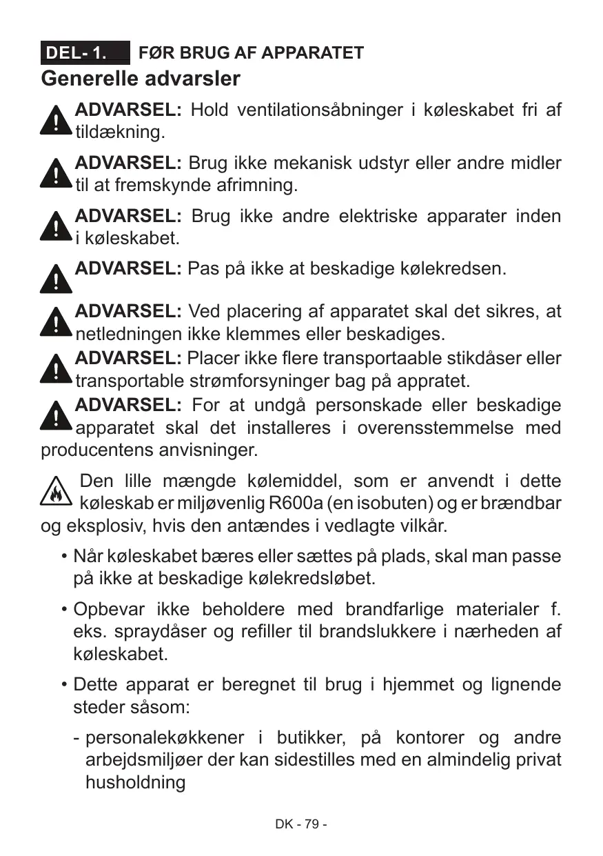 Den lille mængde kølemiddel, som er anvendt i dette køleskab er miljøvenlig R600a (en isobuten) og er brændbar og eksplosiv, hvis den antændes i vedlagte vilkår.