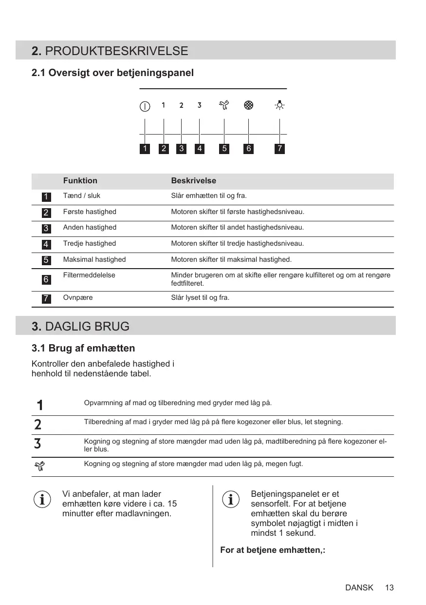 1. Mettez en fonctionnement l’appareil en appuyant sur le symbole . Vous pouvez maintenant activer les fonctions. 2. Pour activer la fonction, appuyez sur le symbole. L’éclairage la hotte fonctionne indépendamment des autres fonctions de la hotte. Pour éclairer la surface de cuisson, appuyez sur