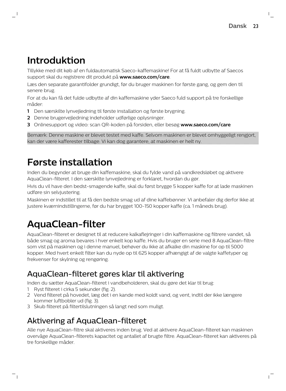 Introduktion Tillykke med dit køb af en fuldautomatisk Saeco-kaffemaskine! For at få fuldt udbytte af Saecos support skal du registrere dit produkt på www.saeco.com/care. Læs den separate garantifolder grundigt, før du bruger maskinen for første gang, og gem den til senere brug. For at du kan få det fulde udbytte af din kaffemaskine yder Saeco fuld support på tre forskellige måder: 1 Den særskilte lynvejledning til første installation og første brygning. 2 Denne brugervejledning indeholder udførlige oplysninger. 3 Onlinesupport og video: scan QR-koden på forsiden, eller besøg www.saeco.com/care Bemærk: Denne maskine er blevet testet med kaffe. Selvom maskinen er blevet omhyggeligt rengjort, kan der være kafferester tilbage. Vi kan dog garantere, at maskinen er helt ny. Første installation Inden du begynder at bruge din kaffemaskine, skal du fylde vand på vandkredsløbet og aktivere AquaClean-filteret. I den særskilte lynvejledning er forklaret, hvordan du gør. Hvis du vil have den bedst-smagende kaffe, skal du først brygge 5 kopper kaffe for at lade maskinen udføre sin selvjustering. Maskinen er indstillet til at få den bedste smag ud af dine kaffebønner. Vi anbefaler dig derfor ikke at justere kværnindstillingerne, før du har brygget 100-150 kopper kaffe (ca. 1 måneds brug). AquaClean-filter AquaClean-filteret er designet til at reducere kalkaflejringer i din kaffemaskine og filtrere vandet, så både smag og aroma bevares i hver enkelt kop kaffe. Hvis du bruger en serie med 8 AquaClean-filtre som vist på maskinen og i denne manuel, behøver du ikke at afkalke din maskine for op til 5000 kopper. Med hvert enkelt filter kan du nyde op til 625 kopper afhængigt af de valgte kaffetyper og frekvenser for skylning og rengøring. AquaClean-filteret gøres klar til aktivering Inden du sætter AquaClean-filteret i vandbeholderen, skal du gøre det klar til brug: 1 Ryst filteret i cirka 5 sekunder (fig. 2). 2 Vend filteret på hovedet, læg det i en kande med koldt vand, og vent, indtil der ikke længere kommer luftbobler ud (fig. 3). 3 Skub filteret på filtertilslutningen så langt ned som muligt. Aktivering af AquaClean-filteret Alle nye AquaClean-filtre skal aktiveres inden brug. Ved at aktivere AquaClean-filteret kan maskinen overvåge AquaClean-filterets kapacitet og antallet af brugte filtre. AquaClean-filteret kan aktiveres på tre forskellige måder.