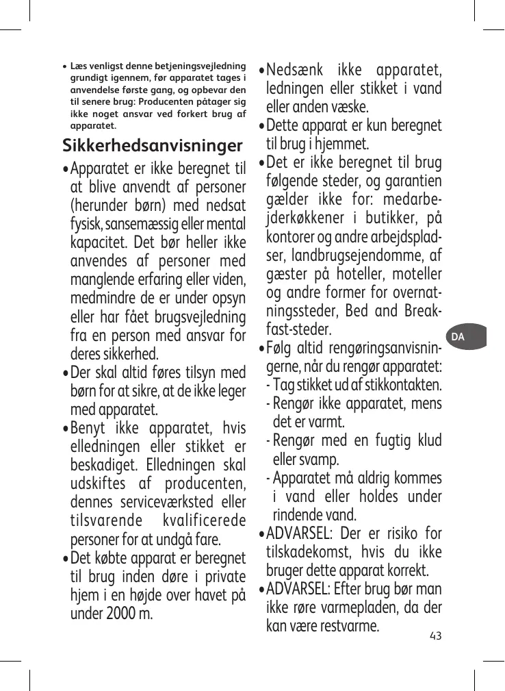 • Nedsænk ikke apparatet, ledningen eller stikket i vand eller anden væske. • Dette apparat er kun beregnet til brug i hjemmet. • Det er ikke beregnet til brug følgende steder, og garantien gælder ikke for: medarbejderkøkkener i butikker, på kontorer og andre arbejdspladser, landbrugsejendomme, af gæster på hoteller, moteller og andre former for overnatningssteder, Bed and Breakfast-steder. • Følg altid rengøringsanvisningerne, når du rengør apparatet: - Tag stikket ud af stikkontakten. - Rengør ikke apparatet, mens det er varmt. - Rengør med en fugtig klud eller svamp. - Apparatet må aldrig kommes i vand eller holdes under rindende vand. • ADVARSEL: Der er risiko for tilskadekomst, hvis du ikke bruger dette apparat korrekt. • ADVARSEL: Efter brug bør man ikke røre varmepladen, da der kan være restvarme. 43