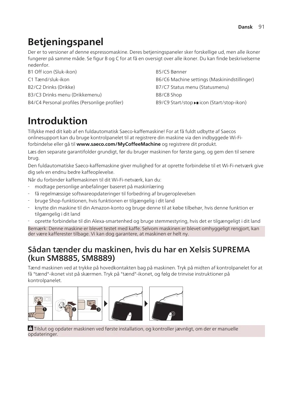 B6/C6 Machine settings (Paramètres de la machine) C1 On/off icon (Icône marche/arrêt) B2/C2 Drinks (Boissons) Votre machine à café Saeco entièrement automatique vous permet de vous connecter à votre réseau Wi-Fi pour une expérience optimale. En connectant votre machine à votre réseau Wi-Fi, vous pourrez : - recevoir des recommandations personnalisées basées sur l’apprentissage machine ; - bénéficier de mises à jour logicielles régulières pour améliorer votre expérience utilisateur ; - accéder à la boutique (sous réserve de disponibilité dans votre pays) ; - associer votre machine à votre compte Amazon (sous réserve de disponibilité dans votre pays) pour vos réapprovisionnements en accessoires ; - vous connecter à votre appareil Alexa et commander vocalement votre machine (sous réserve de disponibilité dans votre pays). Remarque : Cette machine a été testée avec du café. Bien qu'elle ait été soigneusement nettoyée, il se peut que quelques résidus de café subsistent. Nous garantissons néanmoins que la machine est entièrement neuve.