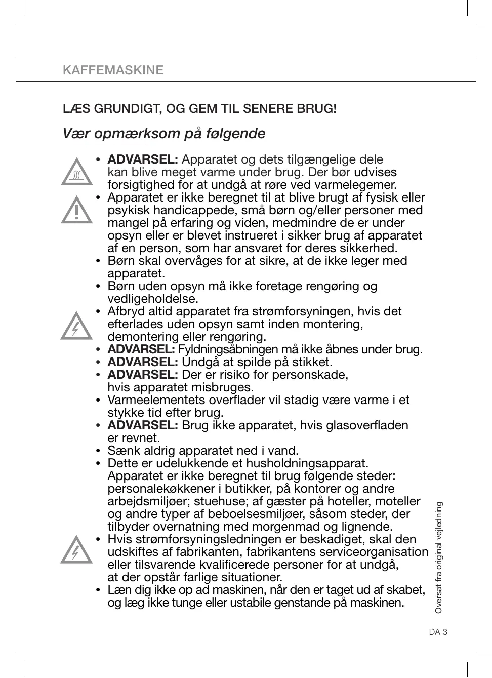 - Læn dig ikke op ad maskinen, når den er taget ud af skabet, og læg ikke tunge eller ustabile genstande på maskinen. Oversat fra original vejledning Vær opmærksom på følgende DA 3 KAFFEMASKINE
