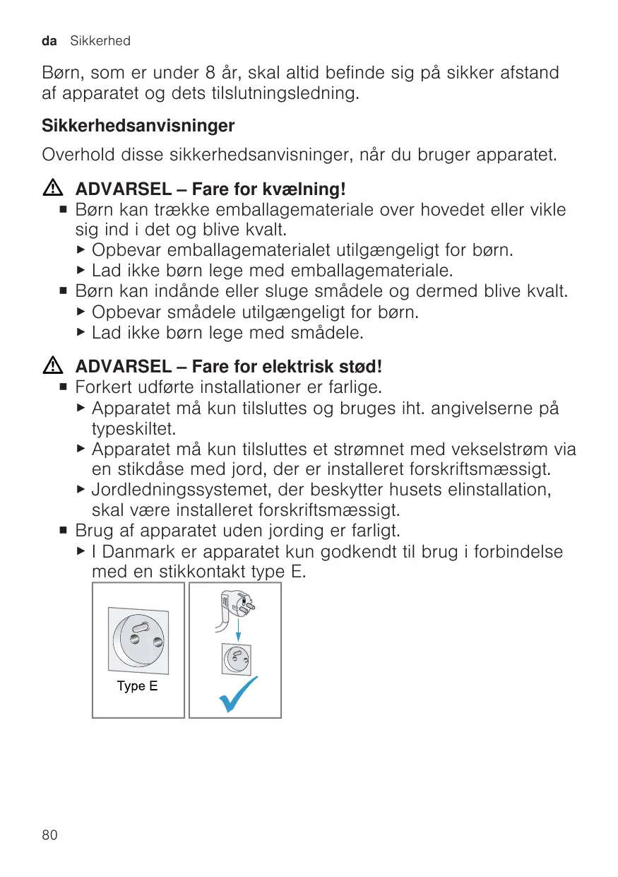 Børn, som er under 8 år, skal altid befinde sig på sikker afstand af apparatet og dets tilslutningsledning. Sikkerhedsanvisninger Overhold disse sikkerhedsanvisninger, når du bruger apparatet. ADVARSEL ‒ Fare for kvælning! ¡ Børn kan trække emballagemateriale over hovedet eller vikle sig ind i det og blive kvalt. ▶ Opbevar emballagematerialet utilgængeligt for børn. ▶ Lad ikke børn lege med emballagemateriale. ¡ Børn kan indånde eller sluge smådele og dermed blive kvalt. ▶ Opbevar smådele utilgængeligt for børn. ▶ Lad ikke børn lege med smådele. ADVARSEL ‒ Fare for elektrisk stød! ¡ Forkert udførte installationer er farlige. ▶ Apparatet må kun tilsluttes og bruges iht. angivelserne på typeskiltet. ▶ Apparatet må kun tilsluttes et strømnet med vekselstrøm via en stikdåse med jord, der er installeret forskriftsmæssigt. ▶ Jordledningssystemet, der beskytter husets elinstallation, skal være installeret forskriftsmæssigt. ¡ Brug af apparatet uden jording er farligt. ▶ I Danmark er apparatet kun godkendt til brug i forbindelse med en stikkontakt type E.