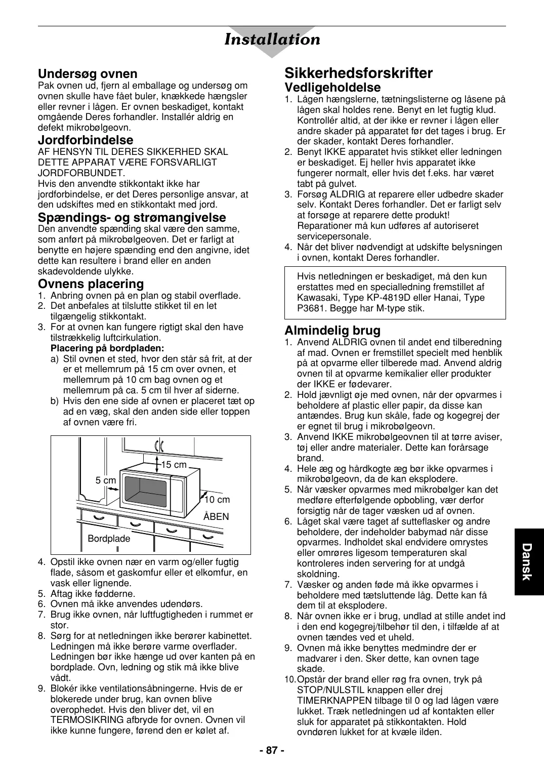 a) Stil ovnen et sted, hvor den stär sà frit, at der er et mellemrum pà 15 cm over ovnen, et mellemrum pä 10 cm bag ovnen og et mellemrum pà ca. 5 cm til hver af siderne.