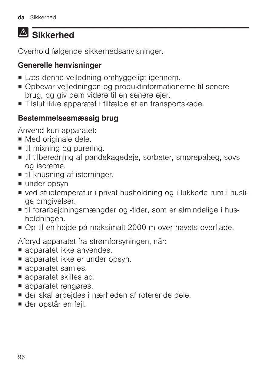 Sikkerhed Overhold følgende sikkerhedsanvisninger. Generelle henvisninger ¡ Læs denne vejledning omhyggeligt igennem. ¡ Opbevar vejledningen og produktinformationerne til senere brug, og giv dem videre til en senere ejer. ¡ Tilslut ikke apparatet i tilfælde af en transportskade. Bestemmelsesmæssig brug Anvend kun apparatet: ¡ Med originale dele. ¡ til mixning og purering. ¡ til tilberedning af pandekagedeje, sorbeter, smørepålæg, sovs og iscreme. ¡ til knusning af isterninger. ¡ under opsyn ¡ ved stuetemperatur i privat husholdning og i lukkede rum i huslige omgivelser. ¡ til forarbejdningsmængder og -tider, som er almindelige i husholdningen. ¡ Op til en højde på maksimalt 2000 m over havets overflade. Afbryd apparatet fra strømforsyningen, når: ¡ apparatet ikke anvendes. ¡ apparatet ikke er under opsyn. ¡ apparatet samles. ¡ apparatet skilles ad. ¡ apparatet rengøres. ¡ der skal arbejdes i nærheden af roterende dele. ¡ der opstår en fejl.