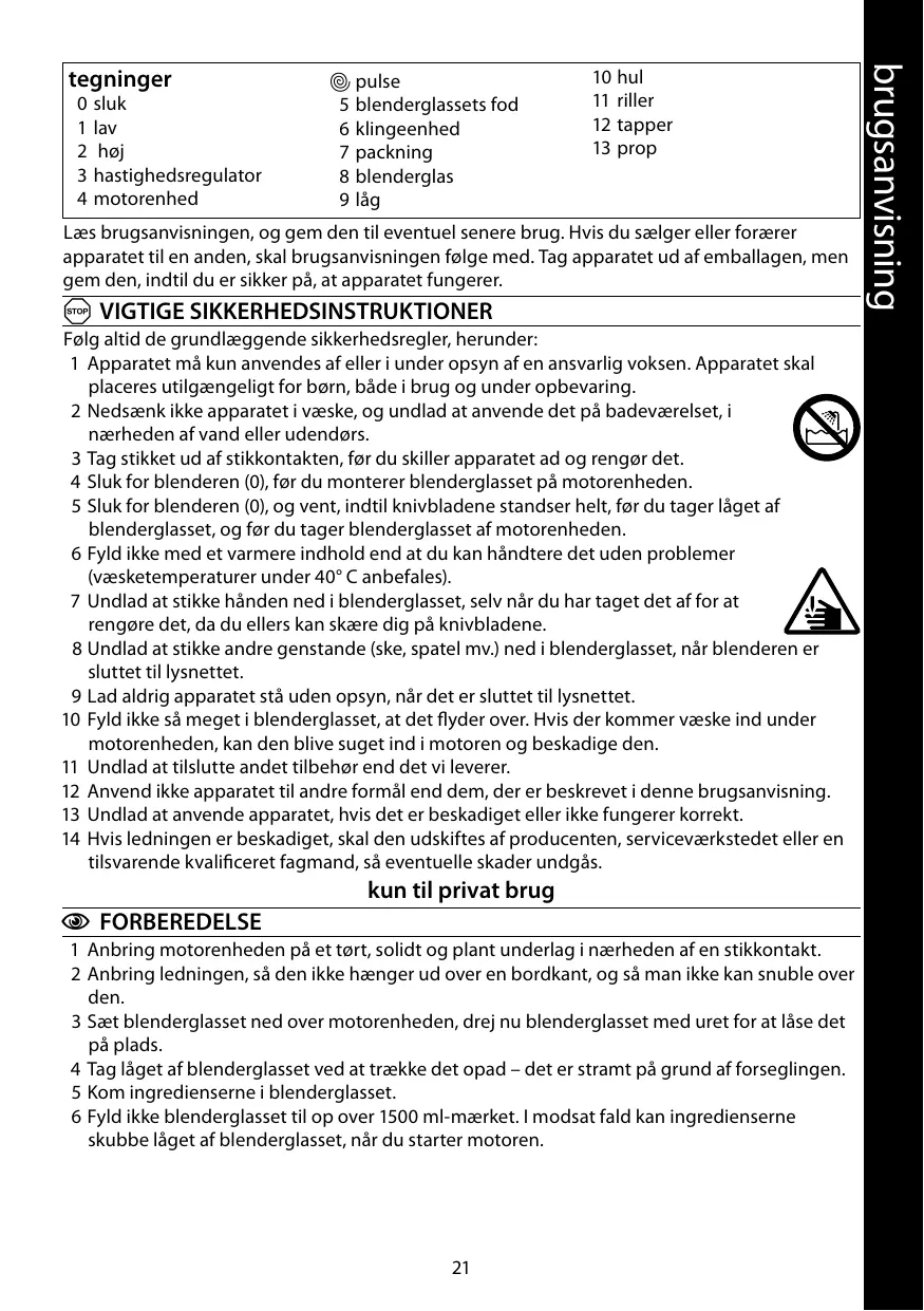 A VIGTIGE SIKKERHEDSINSTRUKTIONER Følg altid de grundlæggende sikkerhedsregler, herunder: 1 Apparatet må kun anvendes af eller i under opsyn af en ansvarlig voksen. Apparatet skal placeres utilgængeligt for børn, både i brug og under opbevaring. 2 Nedsænk ikke apparatet i væske, og undlad at anvende det på badeværelset, i nærheden af vand eller udendørs. 3 Tag stikket ud af stikkontakten, før du skiller apparatet ad og rengør det. 4 Sluk for blenderen (0), før du monterer blenderglasset på motorenheden. 5 Sluk for blenderen (0), og vent, indtil knivbladene standser helt, før du tager låget af blenderglasset, og før du tager blenderglasset af motorenheden. 6 Fyld ikke med et varmere indhold end at du kan håndtere det uden problemer (væsketemperaturer under 40° C anbefales). 7 Undlad at stikke hånden ned i blenderglasset, selv når du har taget det af for at rengøre det, da du ellers kan skære dig på knivbladene. 8 Undlad at stikke andre genstande (ske, spatel mv.) ned i blenderglasset, når blenderen er sluttet til lysnettet. 9 Lad aldrig apparatet stå uden opsyn, når det er sluttet til lysnettet. 10 Fyld ikke så meget i blenderglasset, at det flyder over. Hvis der kommer væske ind under motorenheden, kan den blive suget ind i motoren og beskadige den. 11 Undlad at tilslutte andet tilbehør end det vi leverer. 12 Anvend ikke apparatet til andre formål end dem, der er beskrevet i denne brugsanvisning. 13 Undlad at anvende apparatet, hvis det er beskadiget eller ikke fungerer korrekt. 14 Hvis ledningen er beskadiget, skal den udskiftes af producenten, serviceværkstedet eller en tilsvarende kvalificeret fagmand, så eventuelle skader undgås.