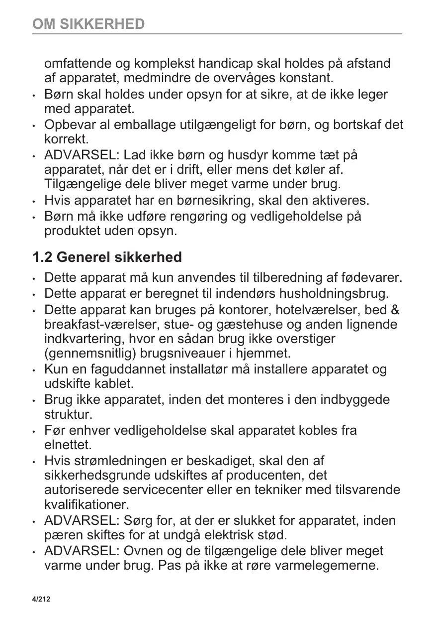 Apparatet må kun bruges af børn fra 8 år og opefter samt af personer med nedsat fysisk, sensorisk eller psykisk funktionsevne, eller som mangler den nødvendige erfaring eller viden, hvis de er under opsyn eller er blevet instrueret i at bruge apparatet på en sikker måde samt forstår de farer, det indebærer. Børn under 8 år og personer med 3/212 OM SIKKERHED