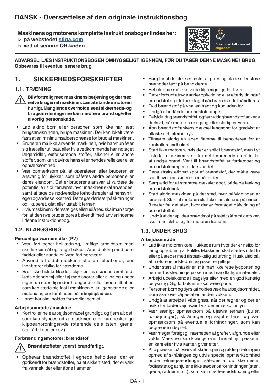 - Sørg for at have fjernet nøgler og værktøj anvendt til vedligeholdelse. BEMÆRK Opbevar maskinen, så den ikke udgør en fare, hvis voksne, børn eller husdyr ved et uheld kommer til at røre ved den. DA - 5 DEUTSCH - Übersetzung der Originalbetriebsanleitung Die vollständigen Betriebsanleitungen der Maschine und des Motors können eingesehen werden: ▷ auf der Website stiga.com ▷ durch Scannen des QR-Codes Download full manual stiga.com ACHTUNG: VOR INBETRIEBNAHME DER MASCHINE DIE GEBRAUCHSANLEITUNG AUFMERKSAM LESEN. Für jede zukünftige Notwendigkeit aufbewahren.