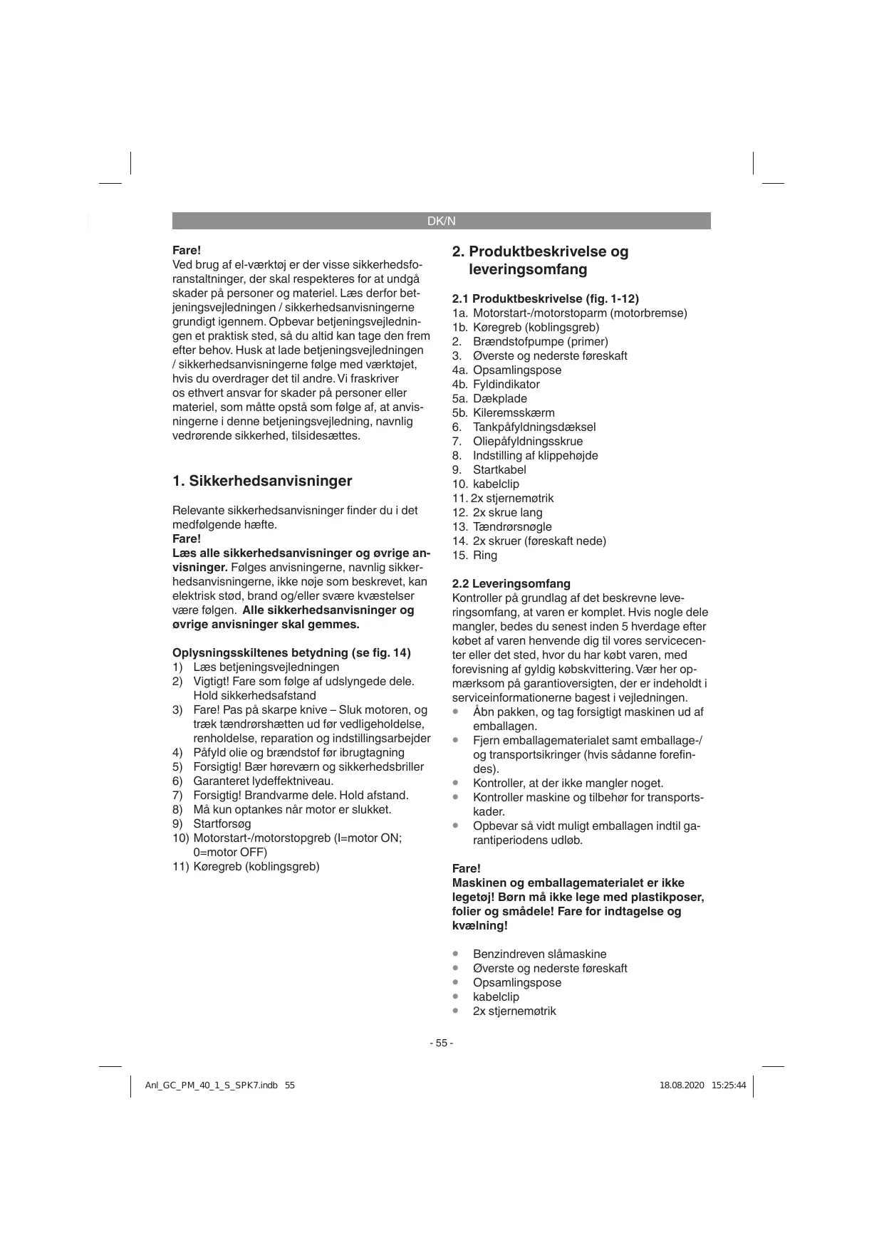 2.1 Description de l’appareil (figure 1-12) 1a. Levier de démarrage/d‘arrêt du moteur (frein du moteur) 1b. Levier de commande (levier d‘accouplement) 2. Pompe à carburant (Primer) 3. Guidon supérieur et inférieur 4a. Sac collecteur 4b. Indicateur de remplissage 5a. Clapet d‘éjection 5b. Recouvrement de courroie trapézoïdale 6. Clapet de remplissage de réservoir 7. Bouchon de remplissage d‘huile 8. Réglage de la hauteur de coupe 9. Cordon de démarrage 10. attache de câble 11. 2x écrous-étoile 12. 2x vis longues 13. Clé à bougie 14. 2x vis (guidon inférieur) • Retirez le matériel d’emballage tout comme les sécurités d’emballage et de transport (s’il y en a). • Vérifiez si la livraison est bien complète. • Contrôlez si l’appareil et ses accessoires ne sont pas endommagés par le transport. • Conservez l’emballage autant que possible jusqu’à la fin de la période de garantie. Danger ! L’appareil et le matériel d’emballage ne sont pas des jouets ! Il est interdit de laisser des enfants jouer avec des sacs et des films en plastique et avec des pièces de petite taille. Ils risquent de les avaler et de s’étouffer !