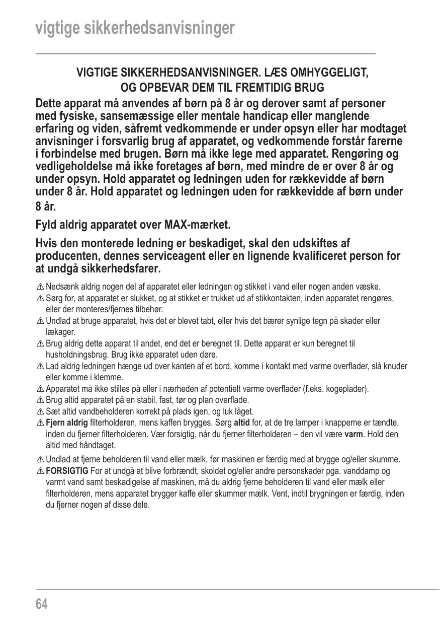 Ne dépassez pas la marque MAX. Si le cordon d’alimentation est endommagé, il doit être remplacé par le fabricant, son représentant agréé ou toute autre personne qualifiée afin d’éviter tout danger. !!Ne plongez pas, même partiellement, l’appareil ou son cordon dans du liquide. !!Assurez-vous que l’appareil est arrêté et débranché après utilisation et avant son nettoyage, ou encore pour monter/retirer un accessoire ou des pièces. !!N’utilisez pas l’appareil s’il a subi un choc, ou en cas de signes visibles de dommages ou en cas de fuite. !!N’utilisez ce produit qu’aux fins pour lesquelles il est prévu. Cet appareil est conçu exclusivement pour une utilisation domestique. N’utilisez pas cet appareil à l’extérieur. !!Ne laissez pas le cordon d’alimentation pendre dans le vide, toucher des surfaces chaudes ou s’emmêler, se bloquer ou se pincer. !!Cet appareil ne doit pas être placé sur ou près de surfaces potentiellement chaudes (telles que des plaques de cuisson au gaz ou à l’électricité). !!Utilisez toujours l’appareil sur une surface stable, sûre, sèche et horizontale. !!Replacez toujours le réservoir d’eau correctement et fermez le couvercle. !!N’enlevez jamais le porte filtre lorsque le café est en cours d’infusion. Assurez-vous toujours que les voyants des trois boutons sont allumés avant d’enlever le porte filtre. Manipulez le porte filtre avec précautions, car il peut être brûlant. Tenez-le toujours par sa poignée. !!Ne retirez pas le réservoir d’eau ou de lait tant pendant les opérations d’infusion et/ou de formation de mousse. !!ATTENTION Afin d’éviter les brûlures, les ébouillantages et/ou autres blessures résultant du contact avec de la vapeur et de l’eau chaude, ou pour ne pas endommager l’appareil, n’enlevez sous aucun prétexte le réservoir à eau ou lait, ou le porte filtre pendant une opération d’infusion ou de formation de mousse. Attendez la fin du cycle d’infusion avant de retirer ces pièces.