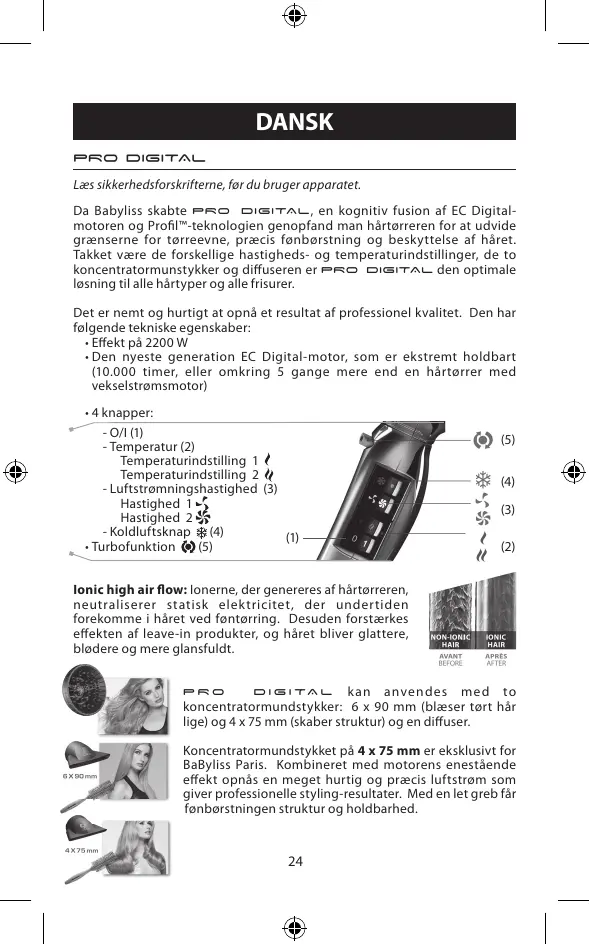 PRO DIGITAL est LA solution optimale pour tous les types de cheveux et toutes les coiffures. Son utilisation est simple et rapide pour un résultat de qualité professionnelle. Il est doté des caractéristiques techniques suivantes : • une puissance de 2200W • un moteur EC Digital nouvelle génération, d’une durée de vie exceptionnelle (10 000 heures, soit 5x plus qu’un sèche-cheveux AC) • 4 interrupteurs : - O/I (1) - températures (2) température position 1 température position 2 Le