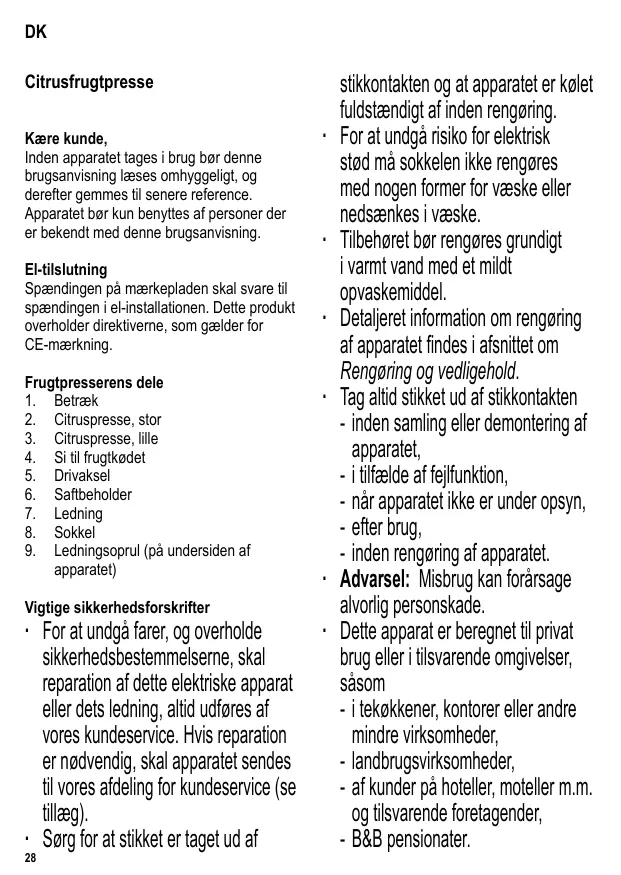 Citrusfrugtpresse Kære kunde, Inden apparatet tages i brug bør denne brugsanvisning læses omhyggeligt, og derefter gemmes til senere reference. Apparatet bør kun benyttes af personer der er bekendt med denne brugsanvisning. El-tilslutning Spændingen på mærkepladen skal svare til spændingen i el-installationen. Dette produkt overholder direktiverne, som gælder for CE-mærkning. Frugtpresserens dele