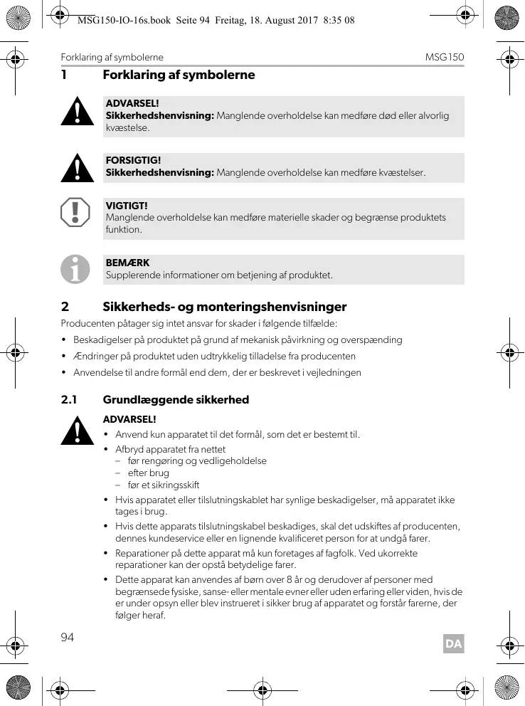 MSG150 Læs denne vejledning omhyggeligt igennem før installation og ibrugtagning, og opbevar den. Giv den til brugeren, hvis du giver produktet videre.