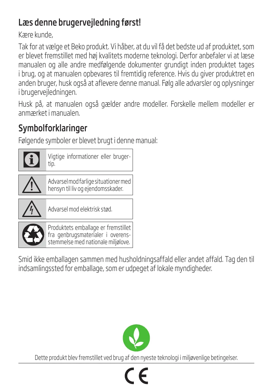 Tak for at vælge et Beko produit. Vi haber, at du vil få det bedste ud af produitet, som er blevet fremstillet med høj kvalitets moderne tekologi. Derfor anbefaler vi at læse manualen og alle andre medfølgende dokumenter grundigt inden produitet tages i brug, og at manualen opbevares til fremtidig reference. Hvis du giver produktret en,anden bruger, husk øgså at aflevere/DDne manual. Følg alle advarsler og oplyninger i brugervejledningen.
