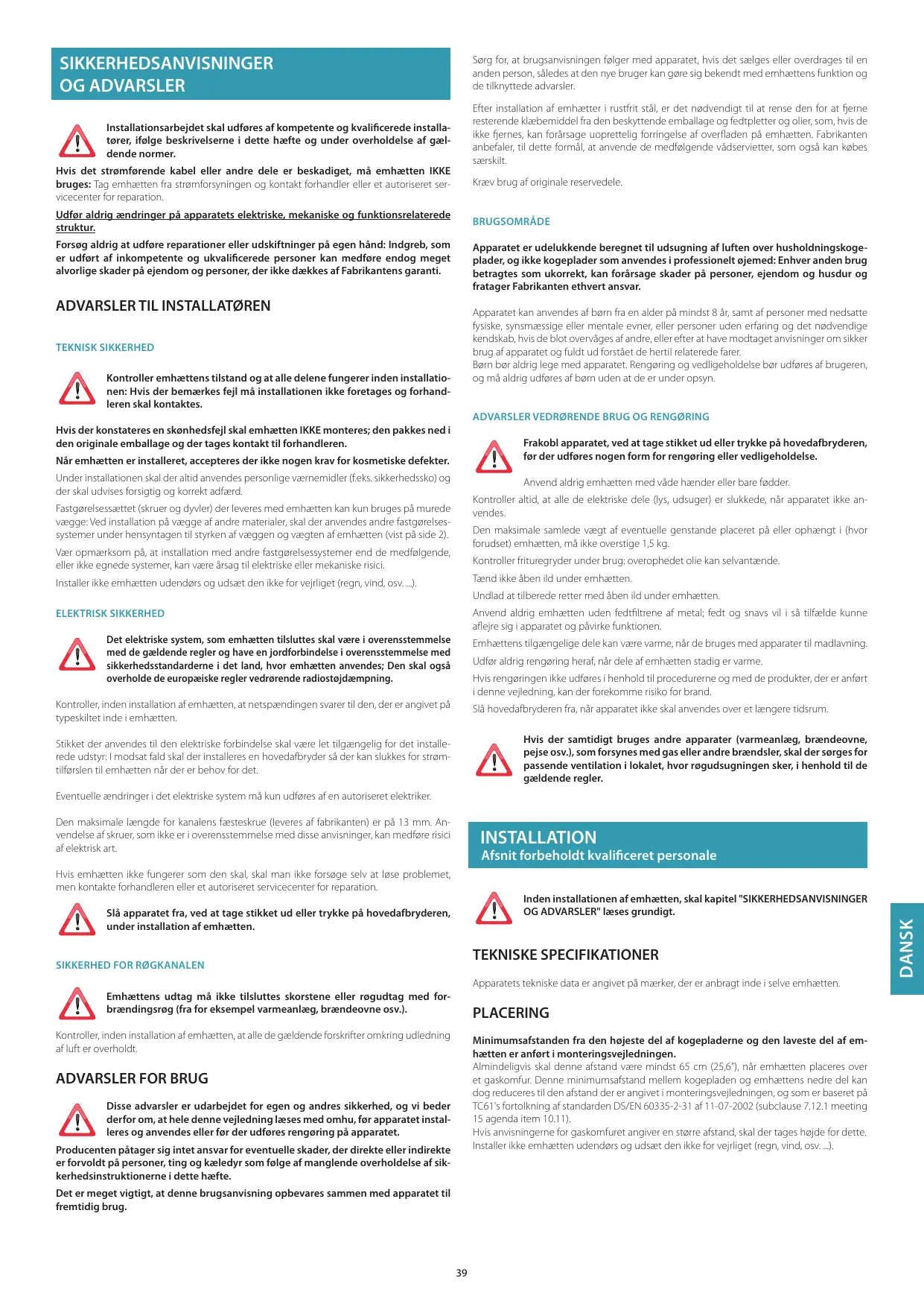 Disse advarsler er udarbejdet for egen og andres sikkerhed, og vi beder derfor om, at hele denne vejledning læses med omhu, før apparatet installeres og anvendes eller før der udføres rengøring på apparatet. Producenten påtager sig intet ansvar for eventuelle skader, der direkte eller indirekte er forvoldt på personer, ting og kæledyr som følge af manglende overholdelse af sikkerhedsinstruktionerne i dette hæfte. Det er meget vigtigt, at denne brugsanvisning opbevares sammen med apparatet til fremtidig brug.