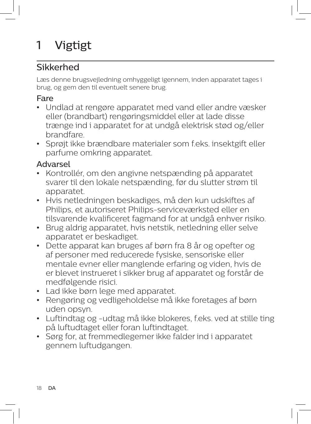 7 • Avant de brancher l'appareil, vérifiez si la tension indiquée sur l'appareil correspond à la tension secteur locale. • Si le cordon d'alimentation est endommagé, il doit être remplacé par Philips, par un Centre Service Agréé Philips ou par un technicien qualifié afin d'éviter tout accident. • N'utilisez jamais l'appareil si la prise, le cordon d'alimentation ou l'appareil lui-même est endommagé. • Cet appareil peut être utilisé par des enfants âgés de 8 ans ou plus, des personnes dont les capacités physiques, sensorielles ou intellectuelles sont réduites ou des personnes manquant d'expérience et de connaissances, à condition que ces enfants ou personnes soient sous surveillance ou qu'ils aient reçu des instructions quant à l'utilisation sécurisée de l'appareil et qu'ils aient pris connaissance des dangers encourus. • Les enfants ne doivent pas jouer avec l'appareil. • Le nettoyage et l'entretien ne doivent pas être réalisés par des enfants sans surveillance. • Ne bloquez pas l'entrée et la sortie d'air (par exemple, en plaçant des objets sur la sortie d'air ou devant l'entrée d'air). FR