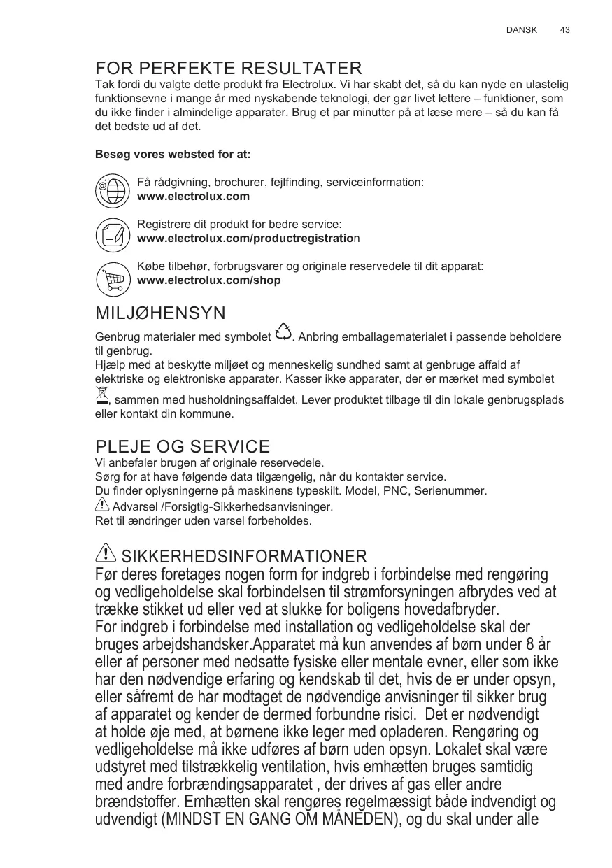 Tak fordi du valgte dette produkt fra Electrolux. Vi har skabt det, så du kan nyde en ulastelig funktionsevne i mange år med nyskabende teknologi, der gør livet lettere – funktioner, som du ikke finder i almindelige apparater. Brug et par minutter på at læse mere – så du kan få det bedste ud af det. Besøg vores websted for at: Få rådgivning, brochurer, fejlfinding, serviceinformation: www.electrolux.com Registrere dit produkt for bedre service: www.electrolux.com/productregistration Købe tilbehør, forbrugsvarer og originale reservedele til dit apparat: www.electrolux.com/shop MILJØHENSYN Genbrug materialer med symbolet . Anbring emballagematerialet i passende beholdere til genbrug. Hjælp med at beskytte miljøet og menneskelig sundhed samt at genbruge affald af elektriske og elektroniske apparater. Kasser ikke apparater, der er mærket med symbolet , sammen med husholdningsaffaldet. Lever produktet tilbage til din lokale genbrugsplads eller kontakt din kommune.