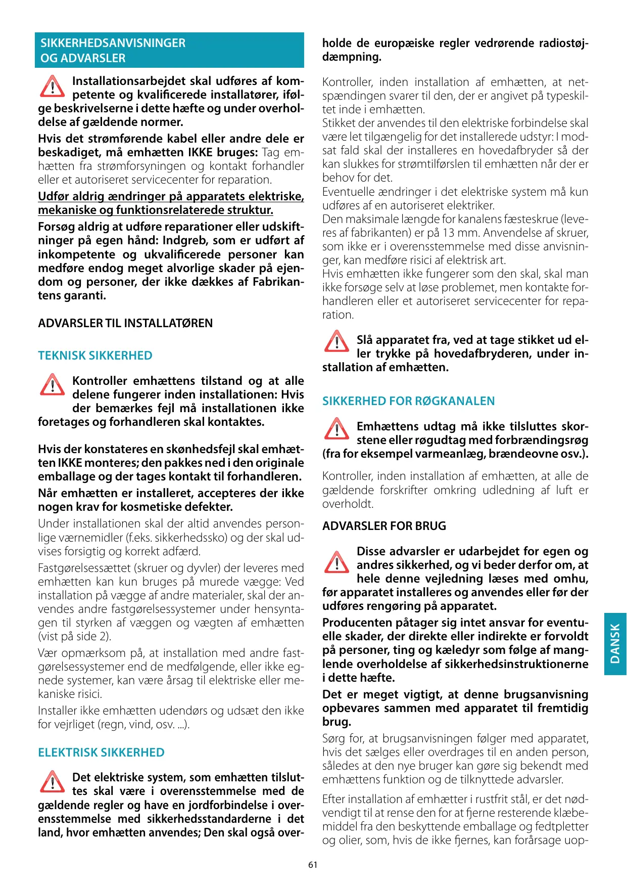 Emhættens udtag må ikke tilsluttes skorstene eller røgudtag med forbrændingsrøg (fra for eksempel varmeanlæg, brændeovne osv.). Hvis der konstateres en skønhedsfejl skal emhætten IKKE monteres; den pakkes ned i den originale emballage og der tages kontakt til forhandleren. Når emhætten er installeret, accepteres der ikke nogen krav for kosmetiske defekter. Under installationen skal der altid anvendes personlige værnemidler (f.eks. sikkerhedssko) og der skal udvises forsigtig og korrekt adfærd. Fastgørelsessættet (skruer og dyvler) der leveres med emhætten kan kun bruges på murede vægge: Ved installation på vægge af andre materialer, skal der anvendes andre fastgørelsessystemer under hensyntagen til styrken af væggen og vægten af emhætten (vist på side 2). Vær opmærksom på, at installation med andre fastgørelsessystemer end de medfølgende, eller ikke egnede systemer, kan være årsag til elektriske eller mekaniske risici. Installer ikke emhætten udendørs og udsæt den ikke for vejrliget (regn, vind, osv. ...). Kontroller, inden installation af emhætten, at alle de gældende forskrifter omkring udledning af luft er overholdt. Disse advarsler er udarbejdet for egen og andres sikkerhed, og vi beder derfor om, at hele denne vejledning læses med omhu, før apparatet installeres og anvendes eller før der udføres rengøring på apparatet. Producenten påtager sig intet ansvar for eventuelle skader, der direkte eller indirekte er forvoldt på personer, ting og kæledyr som følge af manglende overholdelse af sikkerhedsinstruktionerne i dette hæfte. Det er meget vigtigt, at denne brugsanvisning opbevares sammen med apparatet til fremtidig brug. Sørg for, at brugsanvisningen følger med apparatet, hvis det sælges eller overdrages til en anden person, således at den nye bruger kan gøre sig bekendt med emhættens funktion og de tilknyttede advarsler. ELEKTRISK SIKKERHED Det elektriske system, som emhætten tilsluttes skal være i overensstemmelse med de gældende regler og have en jordforbindelse i overensstemmelse med sikkerhedsstandarderne i det land, hvor emhætten anvendes; Den skal også over- Efter installation af emhætter i rustfrit stål, er det nødvendigt til at rense den for at fjerne resterende klæbemiddel fra den beskyttende emballage og fedtpletter og olier, som, hvis de ikke fjernes, kan forårsage uop61 DANSK