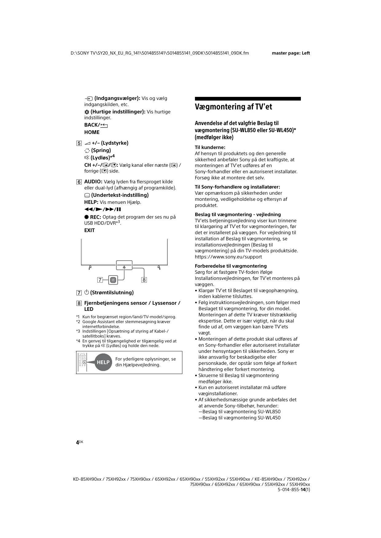 - Benämningarna HDMI och HDMI High-Definition Multimedia Interface och HDMI- logotypen är varumärken eller registrerade varumärken som tillhör HDMI Licensing Administrator, Inc. i USA och andra länder. 9SE KD-85XH90xx / 75XH92xx / 75XH90xx / 65XH92xx / 65XH90xx / 55XH92xx / 55XH90xx / KE-85XH90xx / 75XH92xx / 75XH90xx / 65XH92xx / 65XH90xx / 55XH92xx / 55XH90xx 5-014-855-14(1) D:\SONY TV\SY20_NX_EU_RG_141\5014855141\5014855141_09DK\5014855141_09DK.fm master page: Left Om brugervejledninger Dette TV leveres med følgende brugervejledninger. Opbevar brugervejledningerne for fremtidig reference. Installationsvejledning