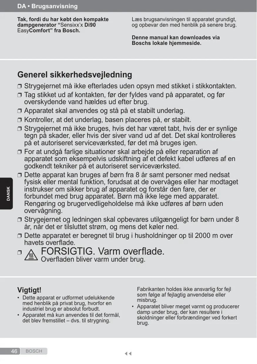 BOSCH Fabrikanten holdes ikke ansvarlig for fejl som følge af fejlagtig anvendelse eller misbrug. • Apparatet bliver meget varmt og producerer damp under brug, der kan resultere i skoldninger eller forbrændinger ved forkert brug.