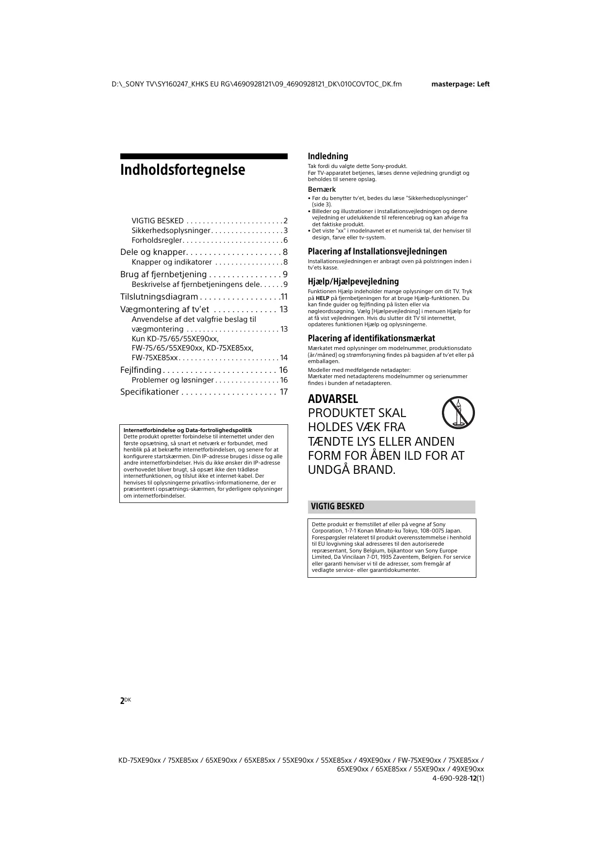 - KD-75XE90xx / 75XE85xx / 65XE90xx / 65XE85xx / 55XE90xx / 55XE85xx / 49XE90xx / FW-75XE90xx / 75XE85xx / 65XE90xx / 65XE85xx / 55XE90xx / 49XE90xx 4-690-928-12(1) D:\_SONY TV\SY160247_KHKS EU RG\4690928121\09_4690928121_DK\010COVTOC_DK.fm Indledning Indholdsfortegnelse Tak fordi du valgte dette Sony-produkt. Før TV-apparatet betjenes, læses denne vejledning grundigt og beholdes til senere opslag. Bemærk VIGTIG BESKED p. 2