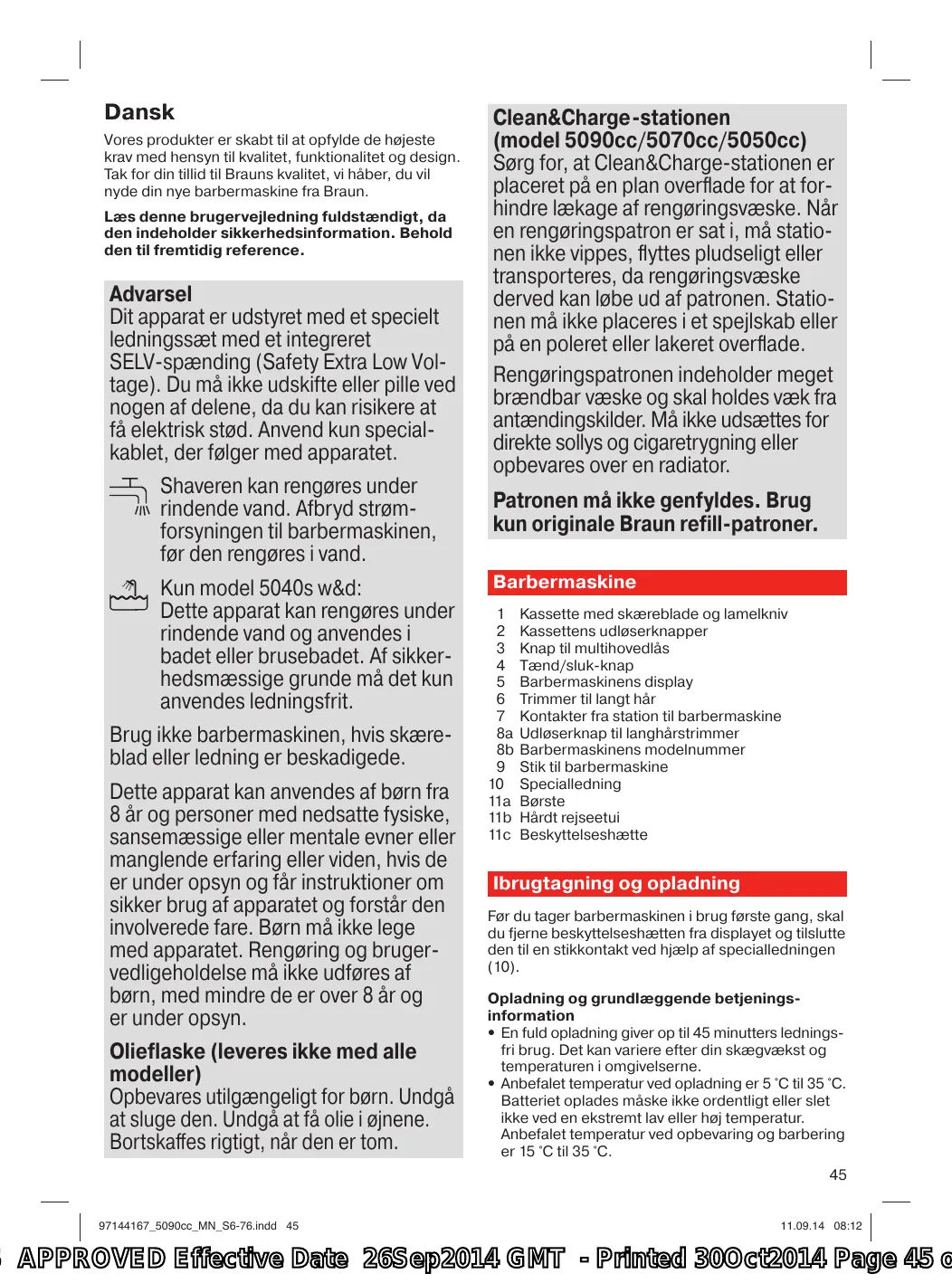 Clean&Charge-stationen (model 5090cc/5070cc/5050cc) Sørg for, at Clean&Charge-stationen er placeret på en plan overflade for at forhindre lækage af rengøringsvæske. Når en rengøringspatron er sat i, må stationen ikke vippes, flyttes pludseligt eller transporteres, da rengøringsvæske derved kan løbe ud af patronen. Stationen må ikke placeres i et spejlskab eller på en poleret eller lakeret overflade. Rengøringspatronen indeholder meget brændbar væske og skal holdes væk fra antændingskilder. Må ikke udsættes for direkte sollys og cigaretrygning eller opbevares over en radiator. Patronen må ikke genfyldes. Brug kun originale Braun refill-patroner. Barbermaskine 1 2 3 4 5 6 7 8a 8b 9 10 11a 11b 11c