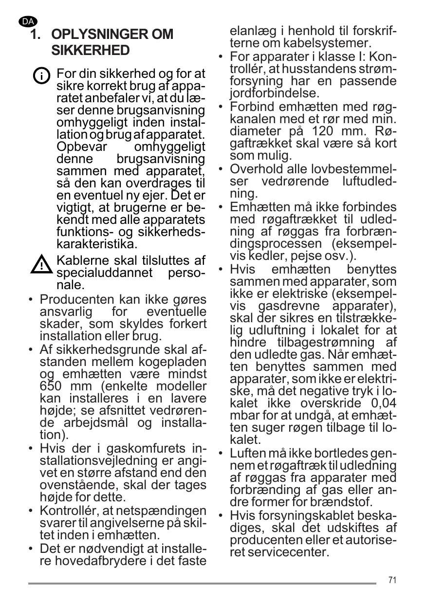 1. SICHERHEITSINFORMA TIONEN Lesen Sie bitte für Ihre eigene Sicherheit und die korrekte Funktion des Geräts diese Betriebsanleitung sorgfältig durch, bevor Sie es installieren und in Betrieb nehmen. Bewahren Sie die Betriebsanleitung stets zusammen mit dem Gerät auf, auch falls Sie dieses verkaufen oder Dritten überlassen. Es ist wichtig, dass die Benutzer mit allen Funktionsund Sicherheitsmerkmalen des Gerätes vertraut sind. Die Kabel müssen von kompetentem Fachpersonal angeschlossen werden. • En aucun cas le fabricant ne peut être tenu pour responsable de dommages éventuellement dus à une installation ou à une utilisation impropre. • La distance de sécurité minimum entre la table de cuisson et la hotte aspirante est de 650 mm (certains modèles peuvent être installés à une hauteur inférieure ; voir le paragraphe concernant les dimensions de travail et l’installation). • Si les instructions d’installation de la table de cuisson à gaz spécifient une distance supérieure à celle indiquée ci-