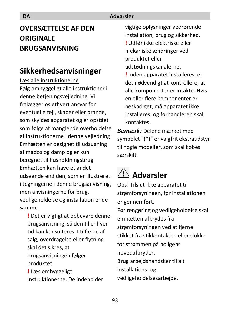 La hotte peut avoir des caractéristiques esthétiques différentes par rapport aux dessins de ce mode d’emploi. Les instructions pour l’utilisation, l'entretien et l’installation restent quoi qu’il en soit les mêmes. ! il est important de conserver ce manuel pour pouvoir le consulter à tout moment. En cas de vente, de cession ou de déménagement, s'assurer qu’il accompagne le produit. ! Lisez les instructions attentivement : il y a