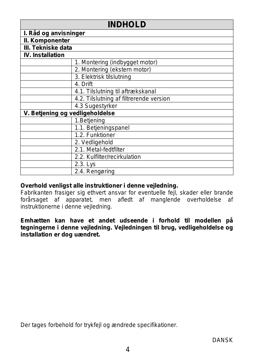 Emhætten kan have et andet udseende i forhold til modellen på tegningerne i/DDne vegledning. Vejledningen til brug, vedligeholdelse og installation er dog uændret.