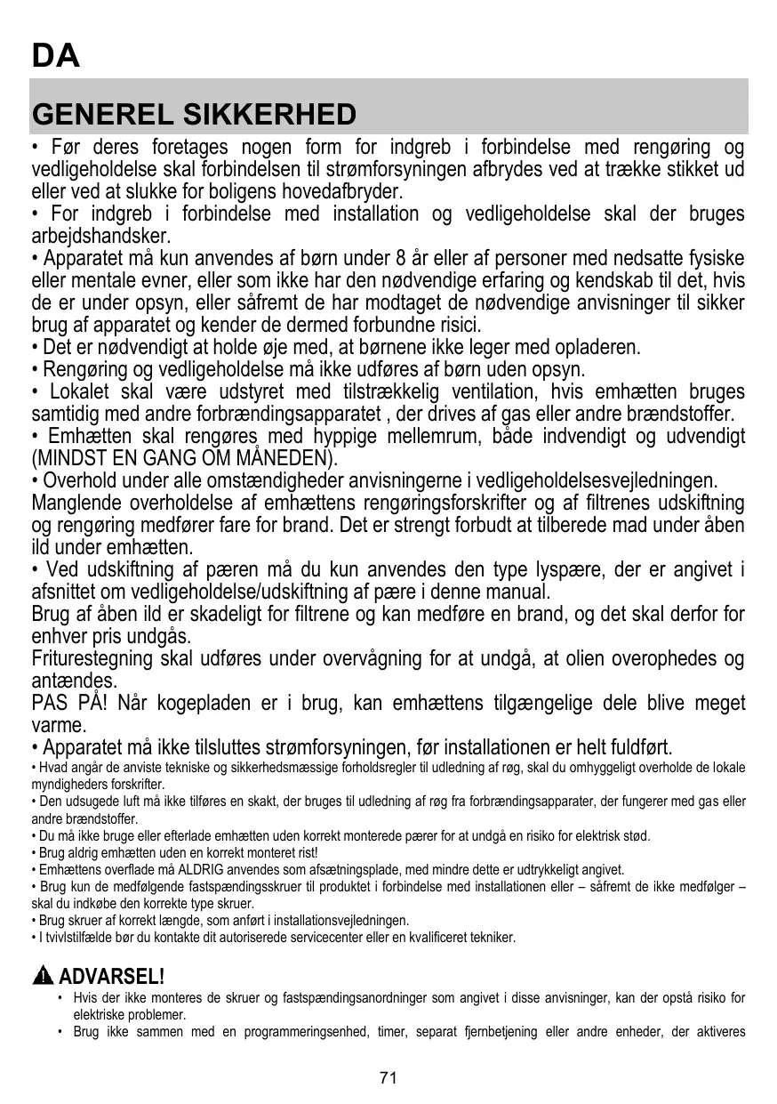 • Les enfants ne doivent pas jouer avec l’appareil. • Le nettoyage et l’entretien par l’usager ne doivent pas être effectués par des enfants sans surveillance. • La pièce doit avoir une aération suffisante lorsque la hotte est utilisée conjointement avec d'autres appareils fonctionnant au gaz ou autres combustibles. • La hotte doit être régulièrement nettoyée à la fois à l'intérieur et à l'extérieur (AU MOINS UNE FOIS PAR MOIS); cela devrait se faire en conformité avec les instructions d'entretien. Le non respect des instructions expressément fournies concernant le nettoyage de la hotte et des filtres peut provoquer des risques d'incendie. • Ne pas flamber d’aliments sous la hotte. • Pour le remplacement de la lampe, utilisez uniquement le type de lampe spécifié dans la section remplacement/maintenance lampe dans ce manuel. L'utilisation d'une flamme nue est dommageable pour les filtres et peut causer un incendie, par conséquent, il est déconseillé de l'utiliser. La friture doit être faite avec soin afin de s’assurer que l’huile surchauffée ne prenne pas feu. AVERTISSEMENT: Lorsque la table de cuisson est en fonctionnement, les parties accessibles de la hotte peuvent devenir très chaudes. • Ne pas brancher l'appareil au réseau électrique avant que l'installation ne soit complètement terminée. • En ce qui concerne les mesures techniques et de sécurité à prendre pour l'évacuation des fumées, respectez strictement les dispositions des règlements locales. • L’air ne doit pas être envoyé dans un conduit utilisé pour évacuer les fumées d’appareils utilisant du gaz ou un autre combustible. • Ne pas utiliser ou laisser la hotte sans les lampes correctement montées, car un éventuel risque de choc électrique est possible. • N’utilisez jamais la hotte sans la grille montée correctement! • La hotte ne doit JAMAIS être utilisée comme une surface d'appui, sauf indication expresse. • Utilisez uniquement les vis de fixation fournies avec le produit pour l'installation, ou, si non fournies, acheter le type correct de vis. • Utilisez la longueur correcte pour les vis qui sont identifiées dans le Guide d'installation. • En cas de doute, consultez votre centre de service agréé ou du personnel qualifié.