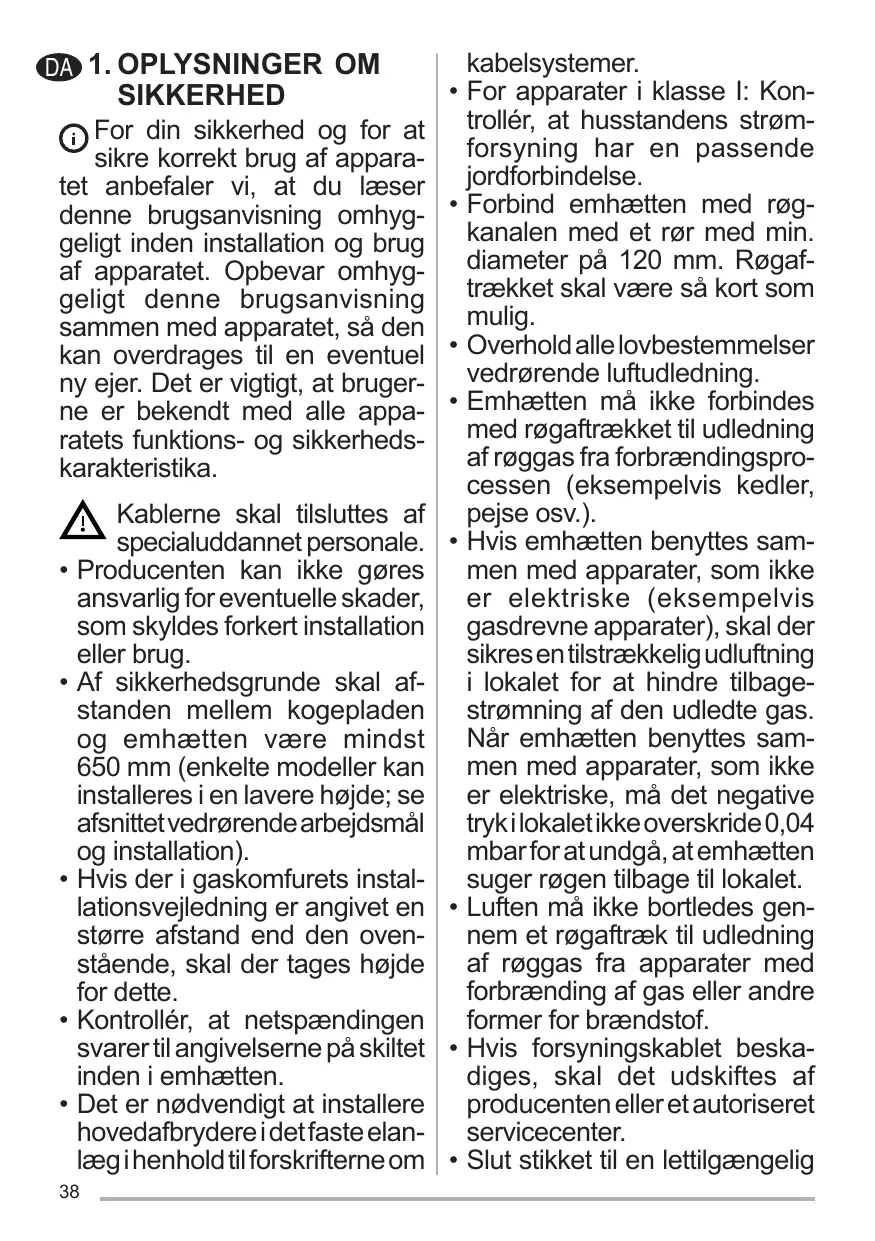 1. SICHERHEITSINFORMATIONEN Zu Ihrer eigenen Sicherheit und für die korrekte Funktion • des Gerätes lesen Sie bitte diese Betriebsanleitung aufmerksam durch, bevor Sie das Gerät installieren und benutzen. Ver- • wahren Sie die Bedienungsanleitung stets zusammen mit dem Gerät, auch wenn Sie dieses an Dritte weitergeben oder über- • tragen. Es ist wichtig, dass der La distance de sécurité mini- • mum entre le plan de cuisson et la hotte aspirante est de 650 mm (certains modèles peuvent être installés à une hauteur inférieure ; voir le paragraphe concernant les dimensions de travail et l’installation). Si les instructions d’installation du plan de cuisson à gaz spécifient une distance supérieure à celle indiquée ci-dessus, veuillez impérativement en tenir compte. Assurez-vous que la tension