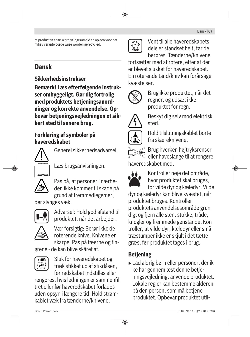 Instrucciones de seguridad ¡Atención! Lea detenidamente las siguientes instrucciones. Familiarícese con los elementos de manejo y el uso reglamentario del producto. Preste atención a que no sean lesionadas por cuerpos extraños proyectados las personas situadas cerca. Advertencia: Mantenga una separación de seguridad respecto al producto en funcionamiento. Atención: No toque las cuchillas en funcionamiento. Las cuchillas están muy afiladas. Tenga cuidado de no cercenarse los dedos de los pies y de las manos. Desconecte el aparato para jardín y saque el enchufe de la red antes de realizar un ajuste, al limpiarlo, si se hubiese enganchado el cable, o siempre que deje desatendido el aparato para jardín, incluso durante un tiempo breve. Mantenga alejado el cable de red de las púas/cuchillas. Espere a que todas las piezas del aparato para jardín se hayan detenido por completo antes de tocarlas. Al desconectar el F 016 L94 116 | (23.10.2020)